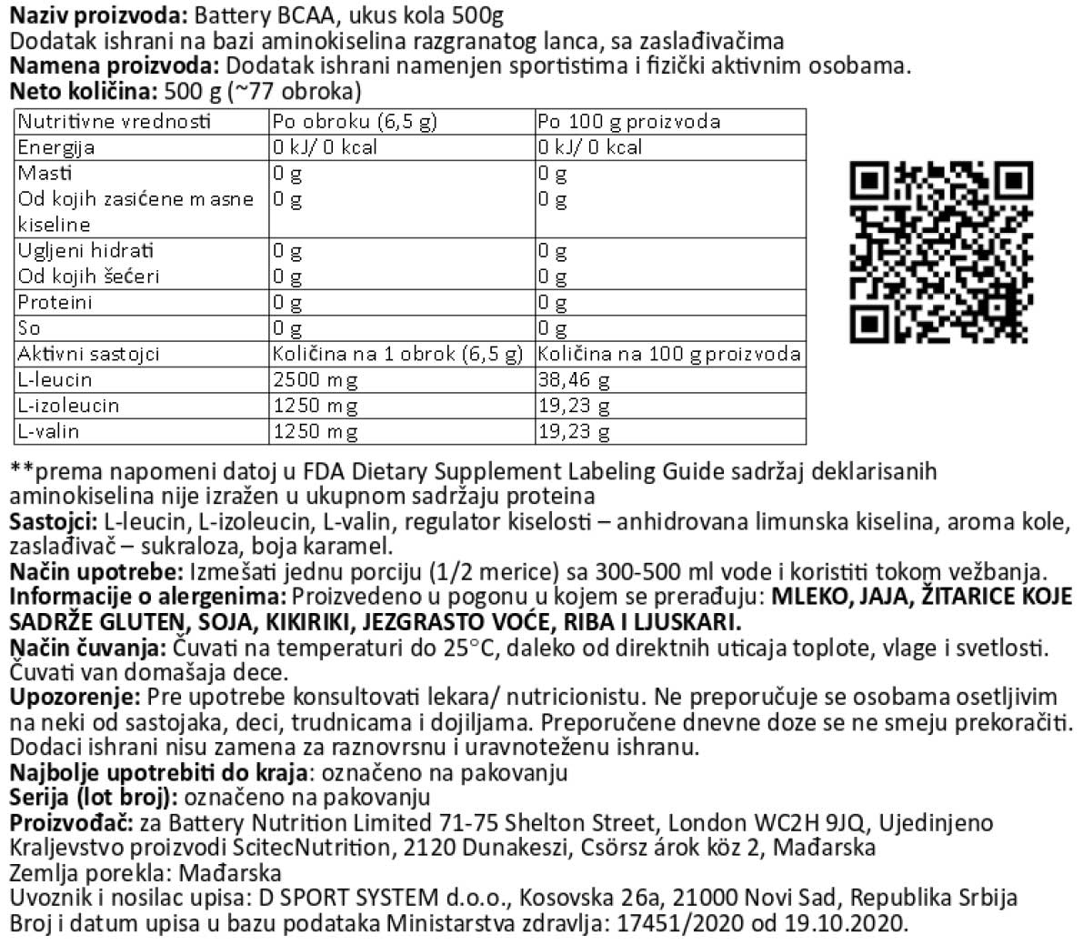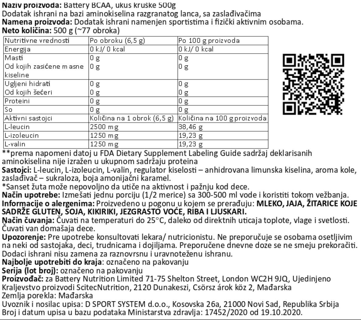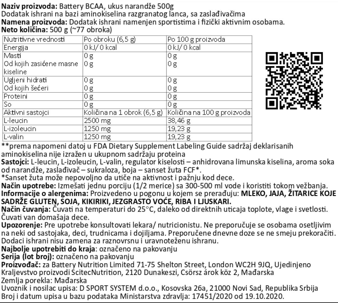 Battery BCAA – je odličnog ukusa i 100% bez ugljenih hidrata i šećera! Battery BCAA koristimo tokom treninga za dodatnu energiju i izdržljivost, kao i za poboljšanu regeneraciju i rast mišićne mase.Battery BCAA se fokusira na uvećanje vaših mišića i brine se o regeneraciji već tokom treninga. Tokom teških treninga, Battery BCAA pruža aminokiseline u svom slobodnom obliku i ima visoku koncentraciju razgranatih aminokiselina – BCAA. Vaši mišići mogu uz dobru regeneraciju imati zdrav rast.