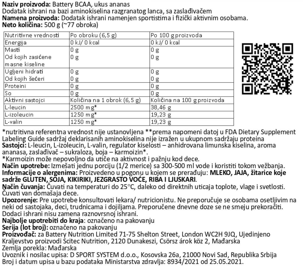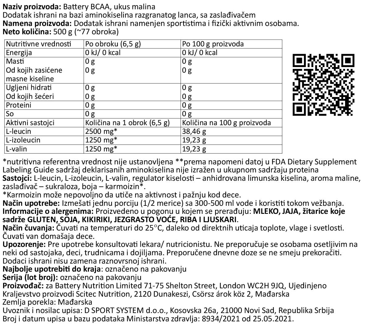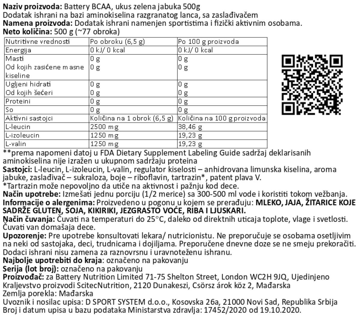 Battery BCAA – je odličnog ukusa i 100% bez ugljenih hidrata i šećera! Battery BCAA koristimo tokom treninga za dodatnu energiju i izdržljivost, kao i za poboljšanu regeneraciju i rast mišićne mase.Battery BCAA se fokusira na uvećanje vaših mišića i brine se o regeneraciji već tokom treninga. Tokom teških treninga, Battery BCAA pruža aminokiseline u svom slobodnom obliku i ima visoku koncentraciju razgranatih aminokiselina – BCAA. Vaši mišići mogu uz dobru regeneraciju imati zdrav rast.