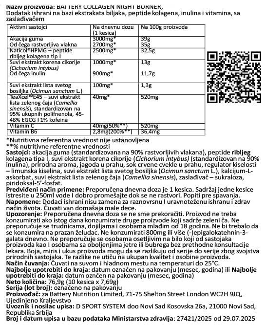Nutritivna vrednost za BATTERY COLLAGEN NIGHT BURNER, 10 kesica, Strawberry