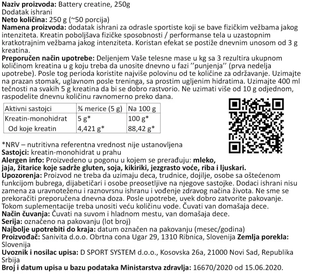 Nutritivna vrednost za BATTERY CREATINE, 250g