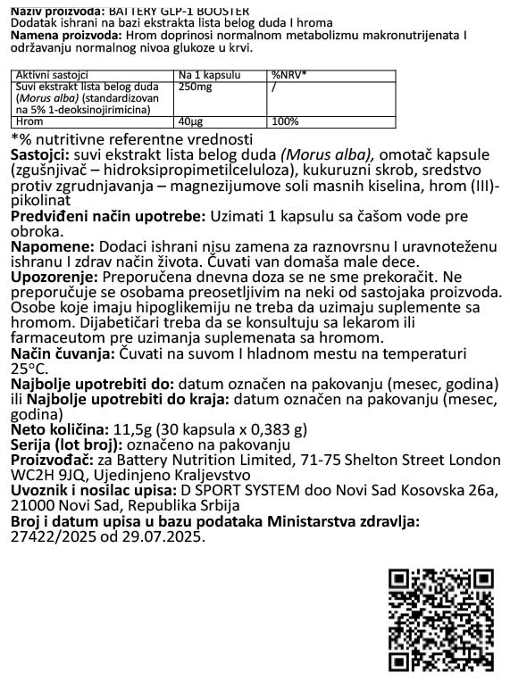Battery GLP‑1 Booster je napredni dodatak ishrani dizajniran da oponaša dejstvo prirodnog hormona GLP‑1 u organizmu — hormona koji nastaje u crevima posle jela i ima ključnu ulogu u regulaciji nivoa šećera, apetita i sitosti. Ovaj kompleks kombinuje dva efikasna i sigurna sastojka — patentirani vodeni ekstrakt listova bele murve Reducose® i mineral visoke bioraspoloživosti, krom pikolinat. Zajedno, oni čine moćnu formulu za podršku ravnoteži glukoze, metabolizmu makronutrijenata i osećaju satosti.