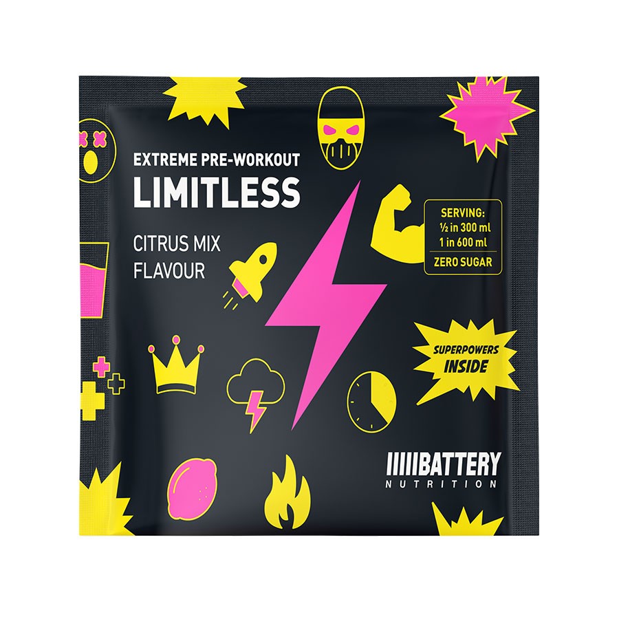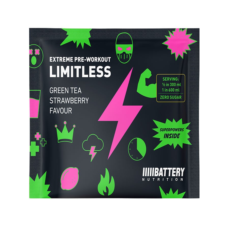 BATTERY LIMITLESS sadrži savršenu kombinaciju sastojaka koji zadovoljavaju sve potrebe sportista za izvođenje intenzivnih treninga. Otkrijte super snagu proizvoda koji će vam pomoći da lakše postignete željene rezultate!