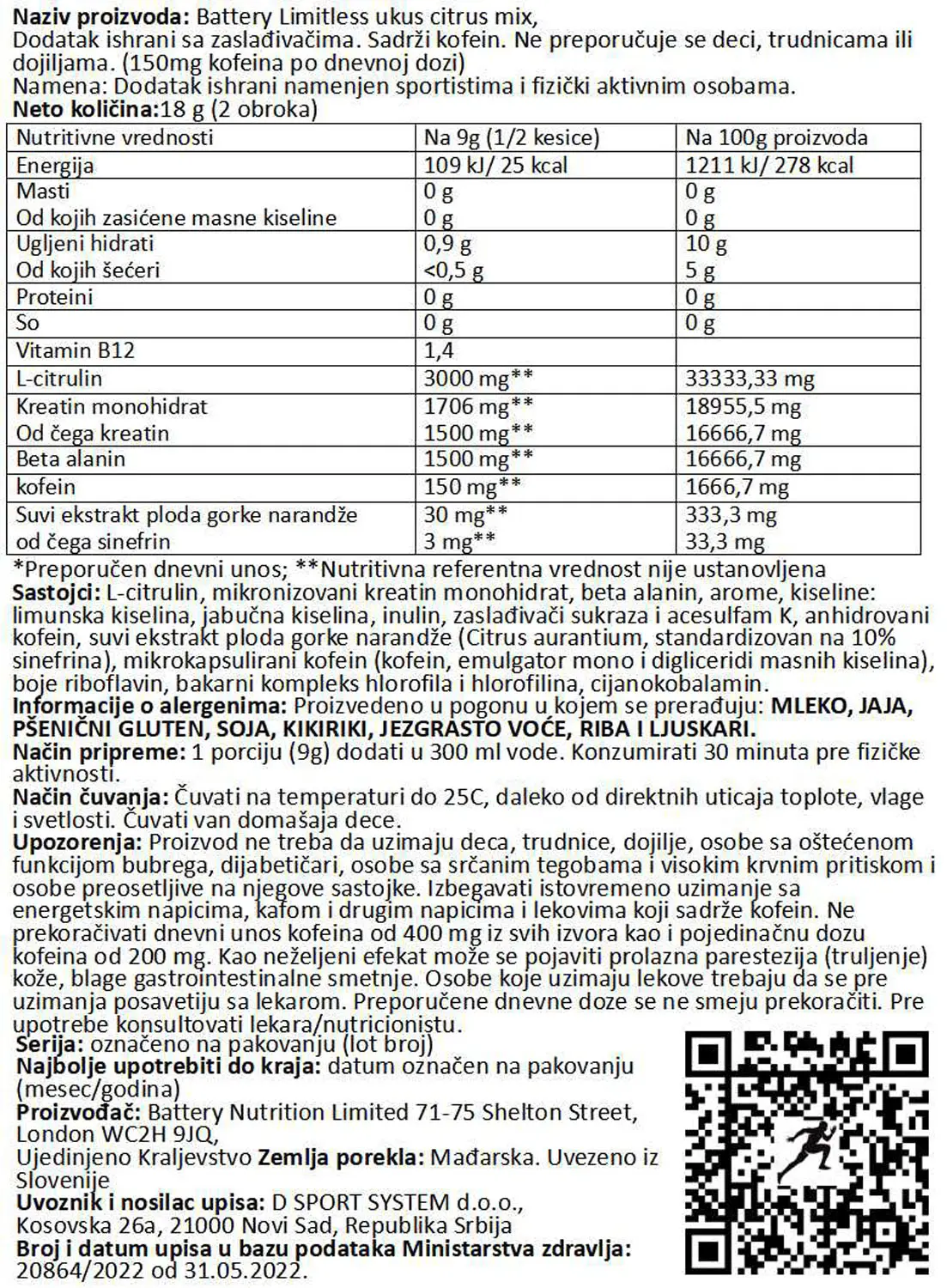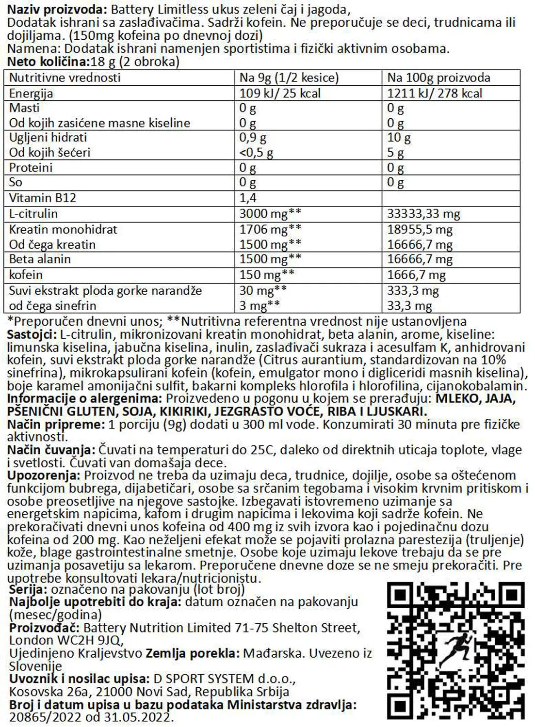 Nutritivna vrednost za BATTERY LIMITLESS,18g