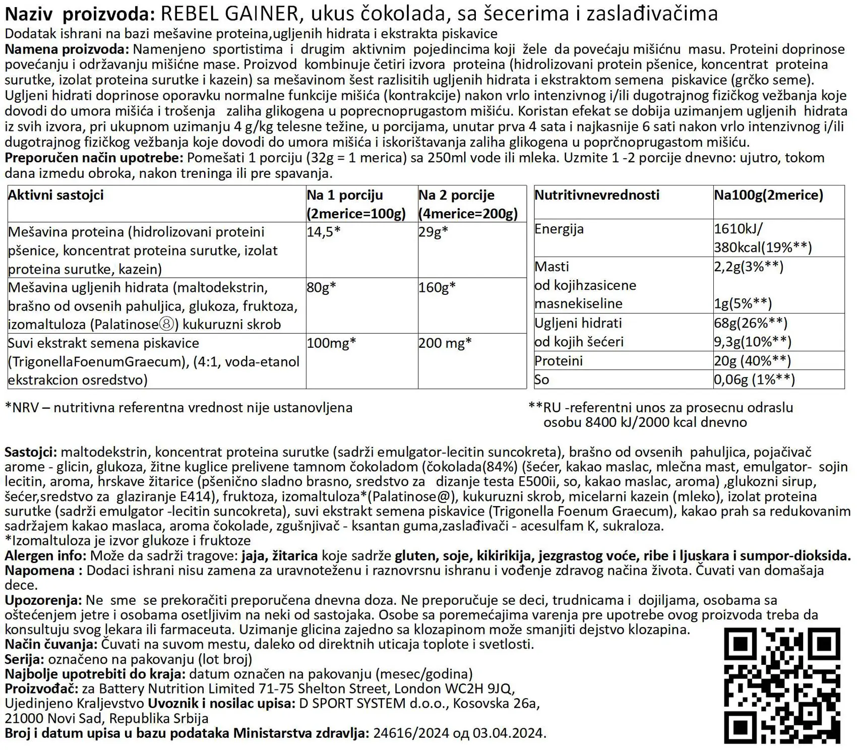 Nutritivna vrednost za BATTERY REBEL MASS GAINER, 3000g, Chocolate