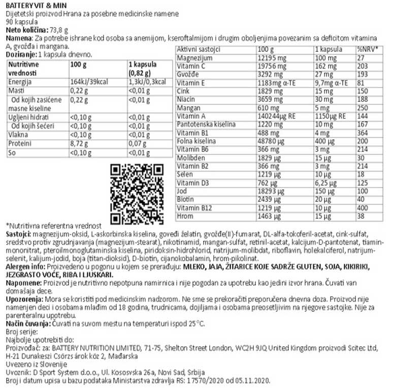 Svi vitamini i minerali koji su vam potrebni u 1 kapsuli. Battery VIT&MIN sadrži ekstrakte različitog povrća, voća, bobičastog i začinskog bilja koji obezbeđuju čitav niz vitamina i minerala. Battery VIT&MIN je dizajnirana po meri fizički aktivnih ljudi i napravljena je za organizovanog čoveka u pokretu kome je potrebna dnevna doza vitamina u jednoj tableti.
