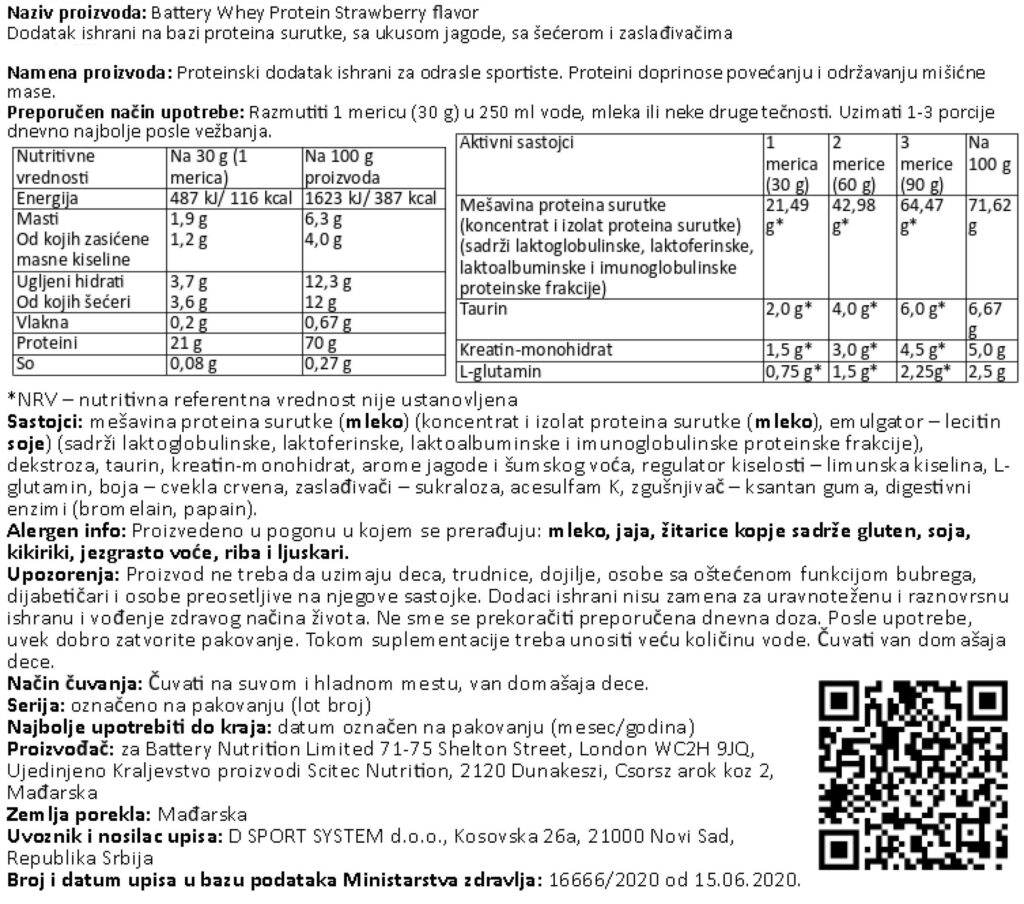Nutritivna vrednost za BATTERY WHEY PROTEIN, 1800g