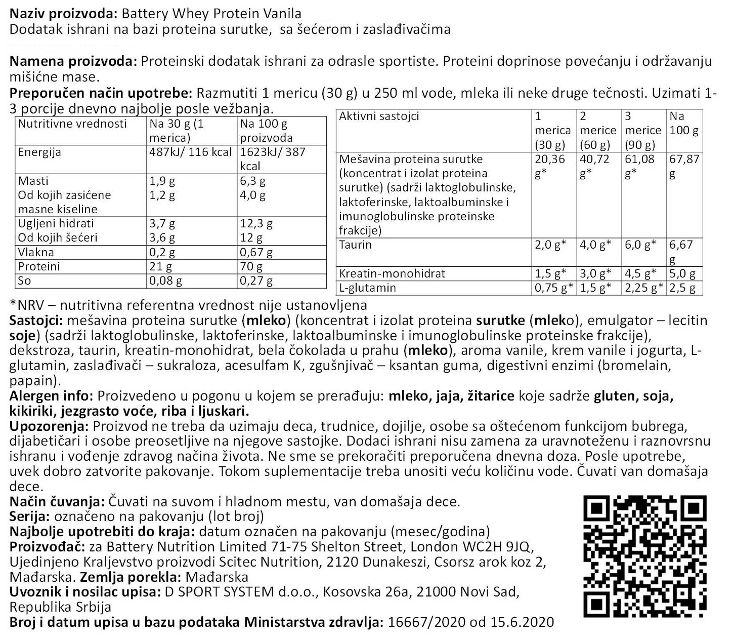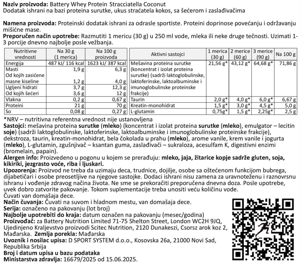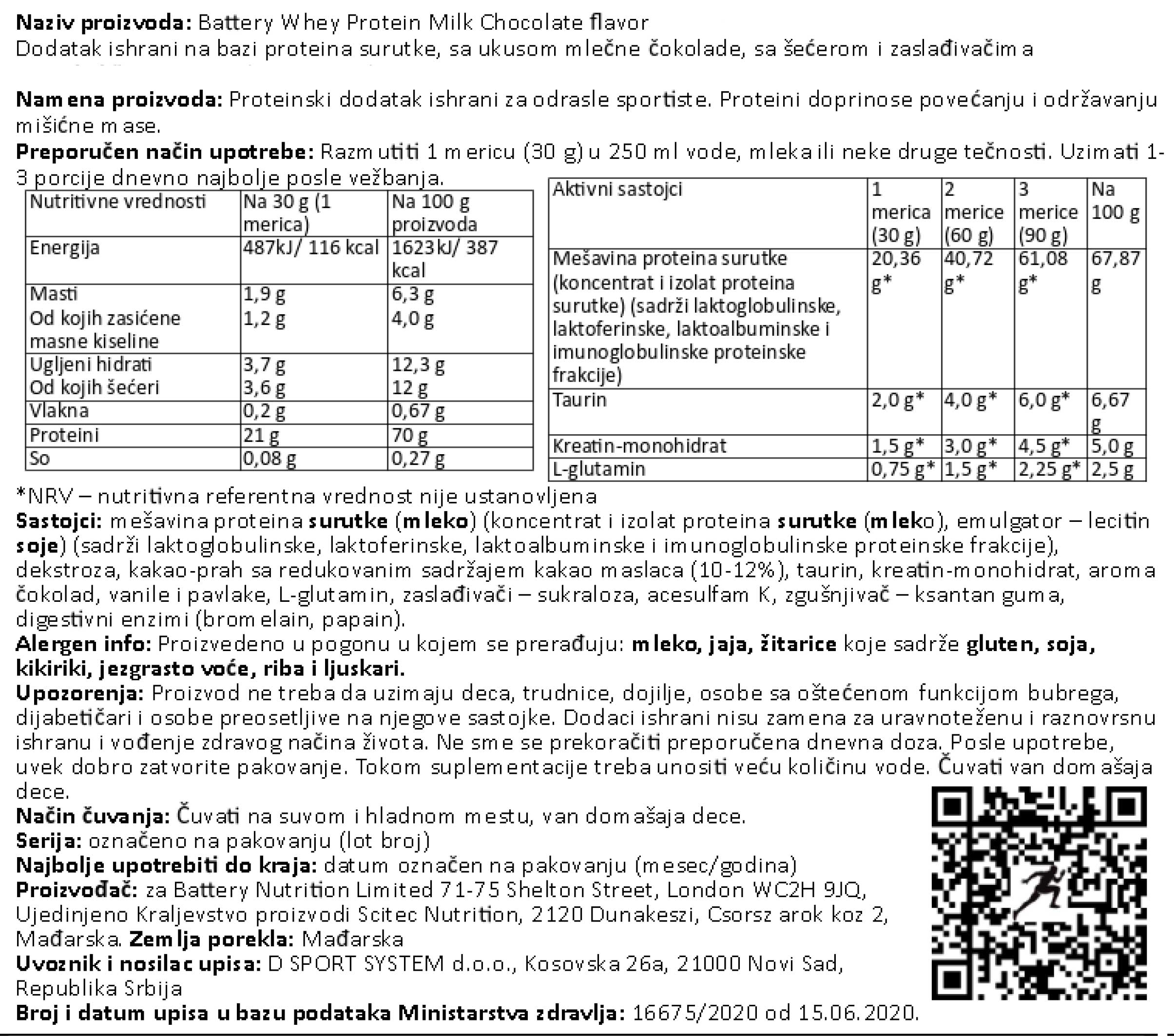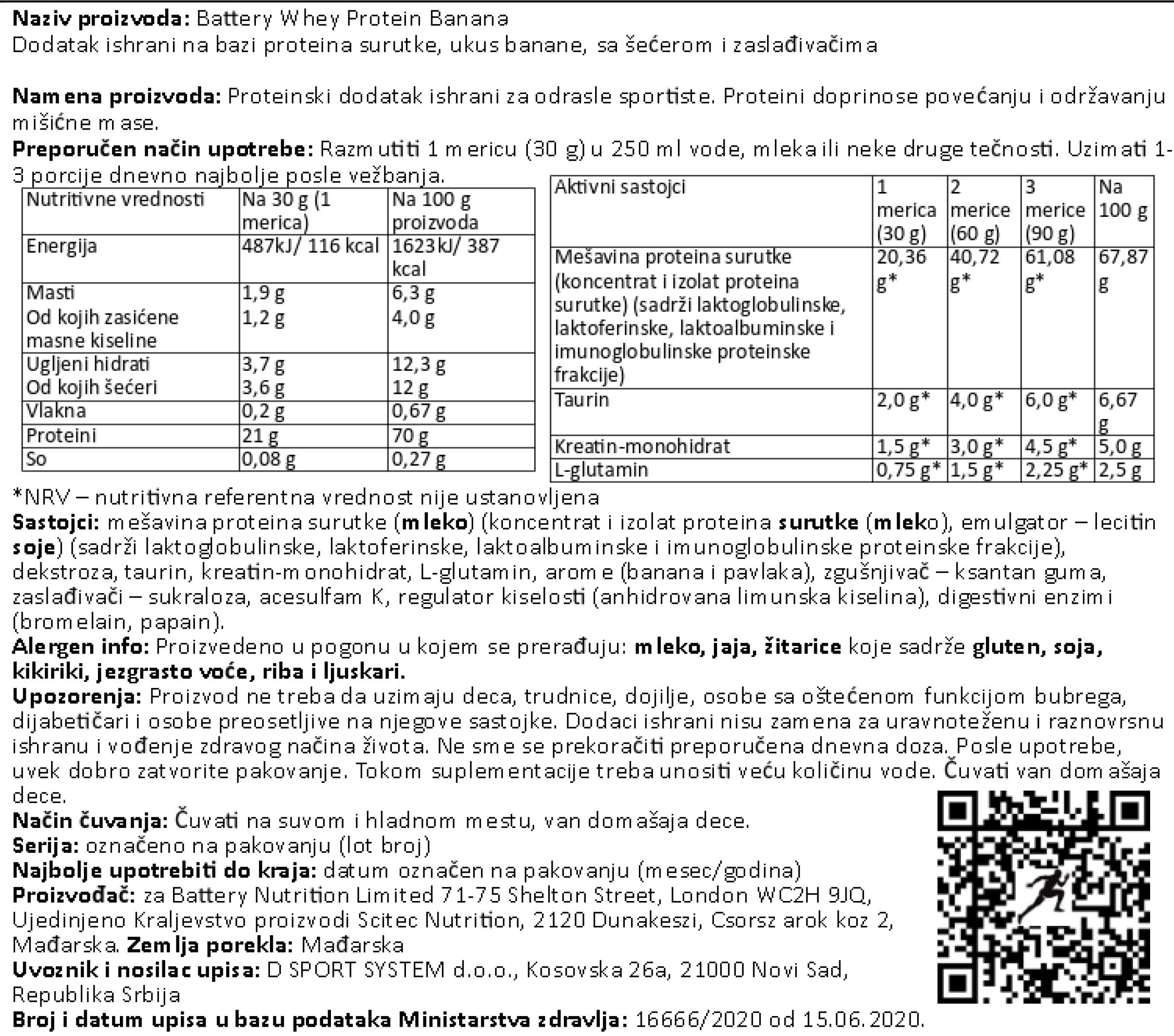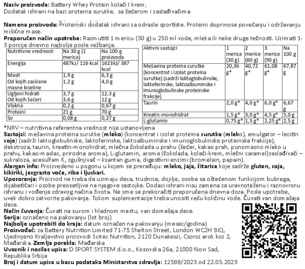 Nutritivna vrednost za BATTERY WHEY PROTEIN, 800g