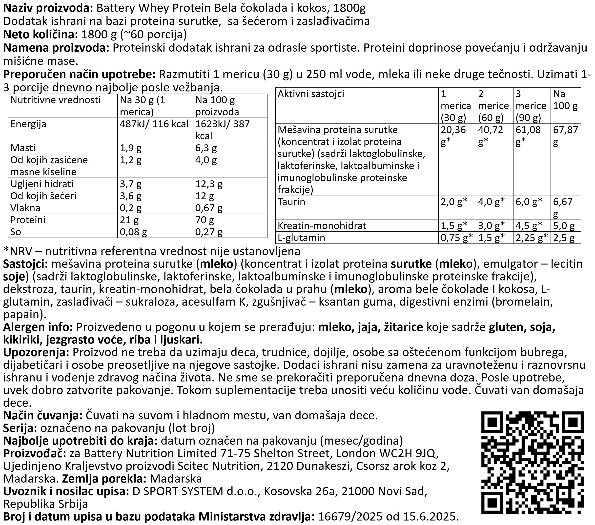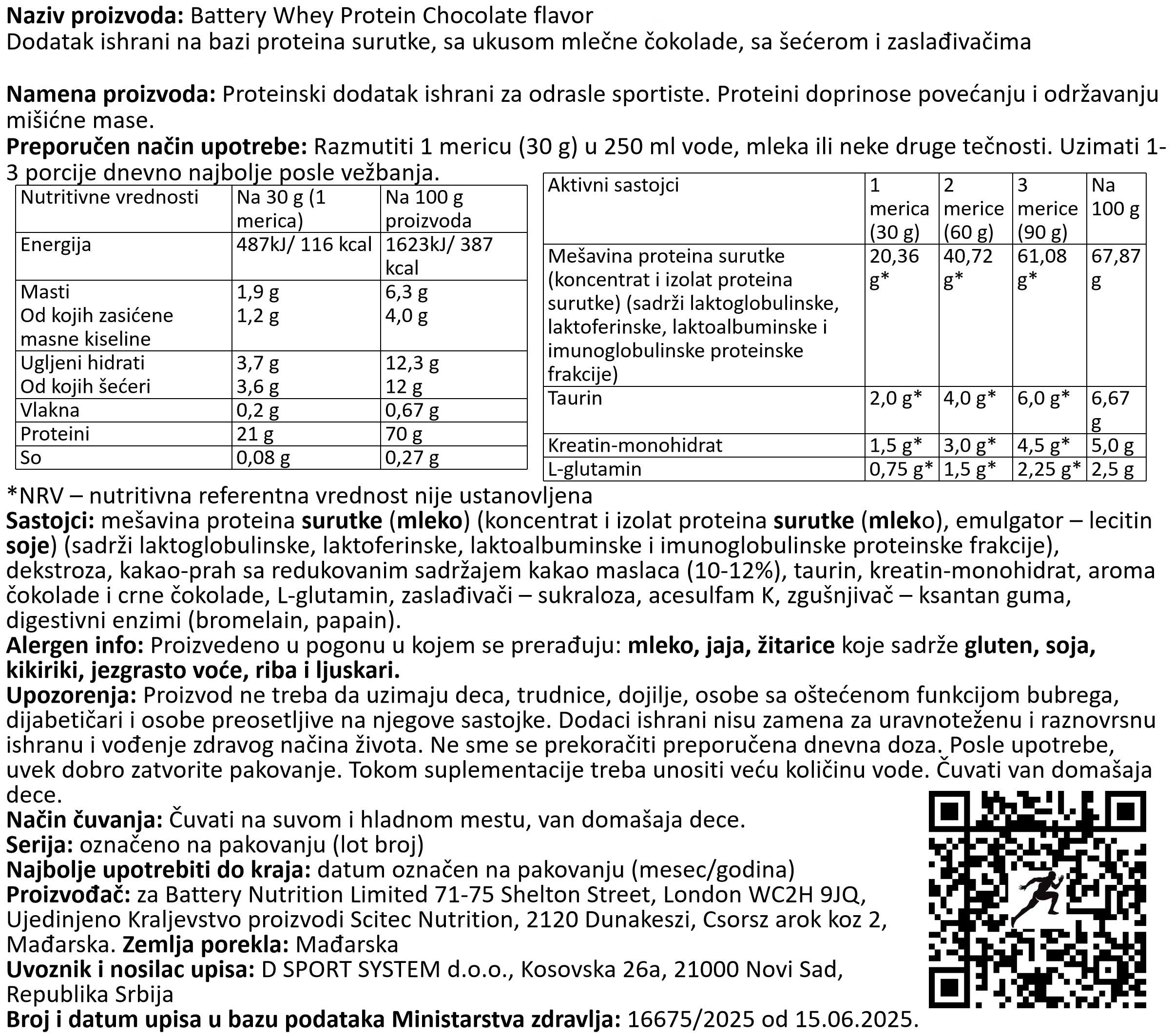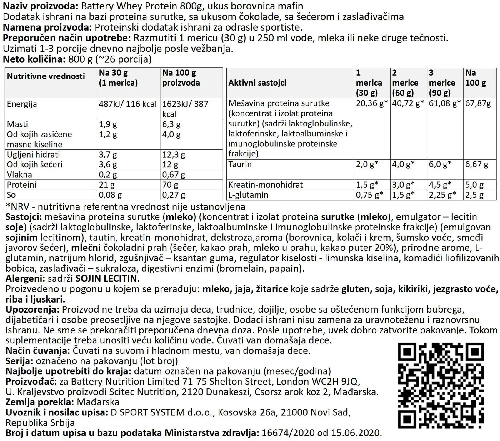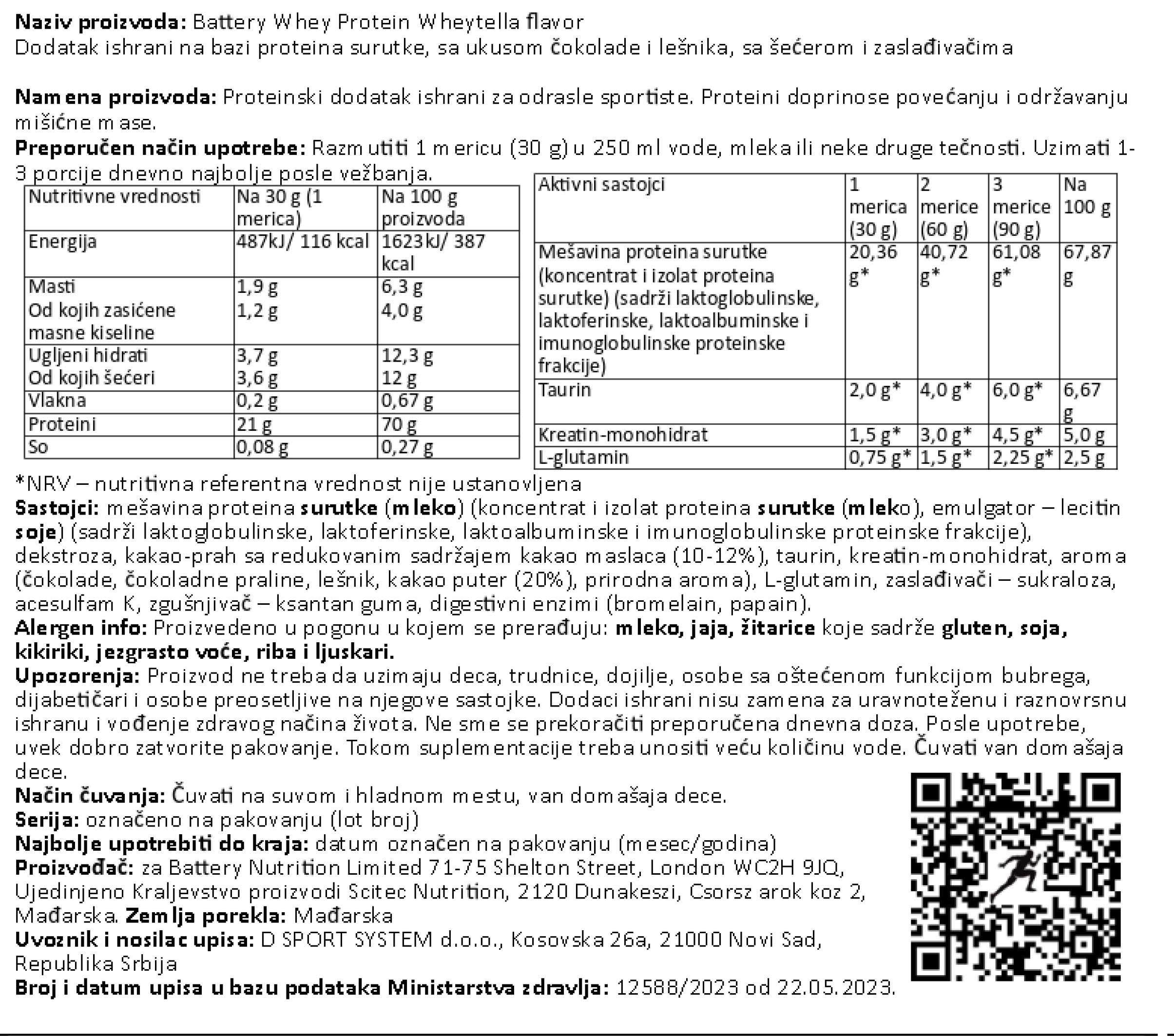 Nutritivna vrednost za BATTERY WHEY PROTEIN, 800g
