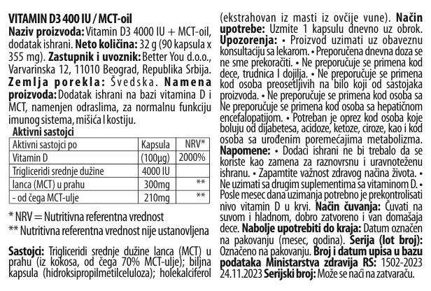 Vitamin D igra ključnu ulogu u očuvanju jakog imunog sistema, jer pomaže telu da se efikasno bori protiv infekcija, virusa i upala.Ovaj moćni suplement obezbeđuje optimalnu dnevnu dozu koja pomaže u jačanju organizma i održavanju vitalnosti tokom cele godine.Vitamin D je vitamin rastvorljiv u mastima, što znači da je za njegovu optimalnu apsorpciju u organizmu neophodna prisutnost masti. Upravo zbog toga, dodata je mala količina MCT masti iz kokosovog ulja, koja pomaže da vitamin D3 bude efikasnije apsorbovan i iskoršćen u telu. Takođe, podržava zdravlje kostiju i mišića tako što poboljšava apsorpciju kalcijuma i fosfora, koji su neophodni za gustinu kostiju i prevenciju osteoporoze.