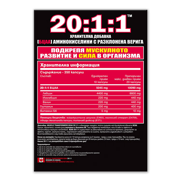 MUSCLE TRANSFORMERS BCAA 20:1:1 je inovativan, visokointenzivan amino kompleks koji sadrži ekstremno visoku koncentraciju leucina, uz optimalno dozirane izoleucin i valin, dodatno pojačane glutaminom i vitaminom B6.