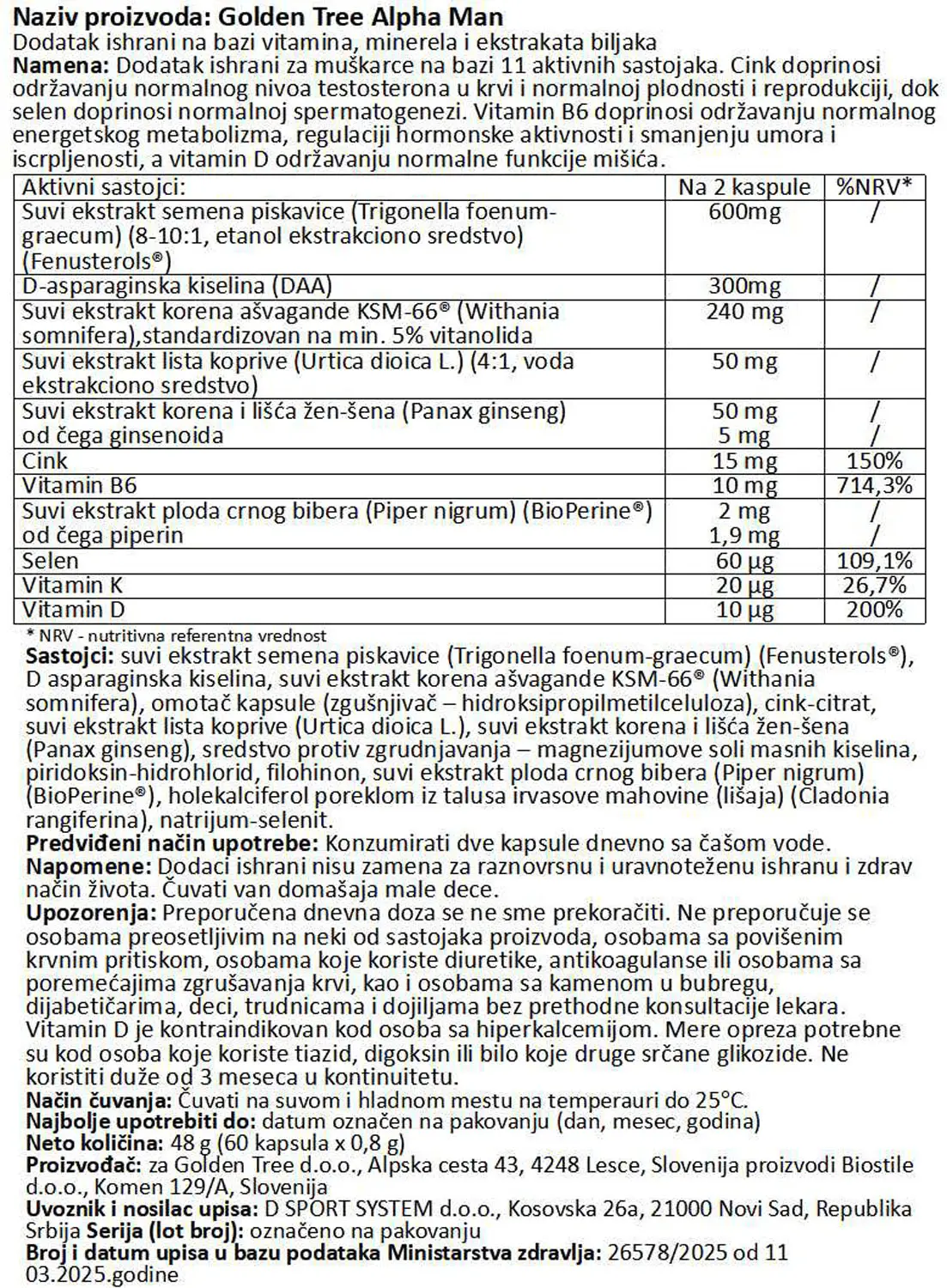 Nutritivna vrednost za GOLDEN TREE ALPHA MAN, 60 kapsula