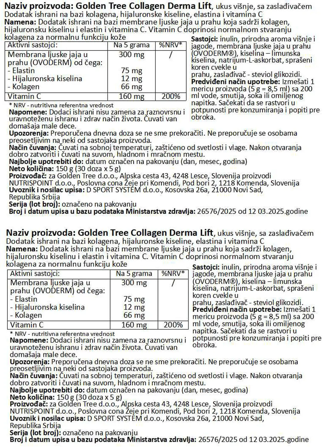 Nutritivna vrednost za GOLDEN TREE COLLAGEN DERMA LIFT, 150g, Cherry
