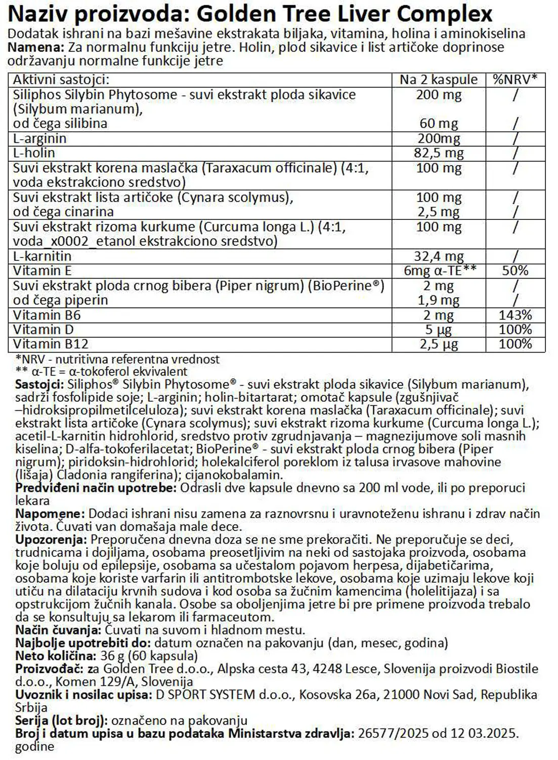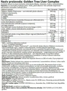 Golden Tree Liver Complex je dodatak ishrani formulisan da podrži zdravlje jetre i poboljša opšte stanje organizma. Sadrži 12 aktivnih sastojaka, uključujući patentirane ekstrakte i vitamine, koji zajedno deluju na detoksikaciju jetre, stimulaciju proizvodnje žuči i poboljšanje varenja.