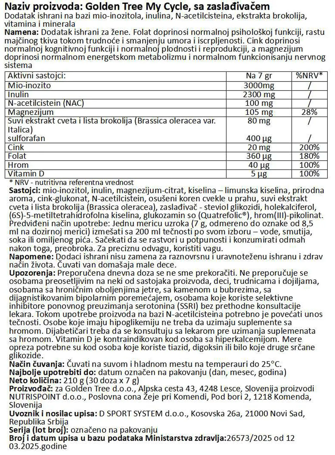 Nutritivna vrednost za GOLDEN TREE MY CYCLE, 210g