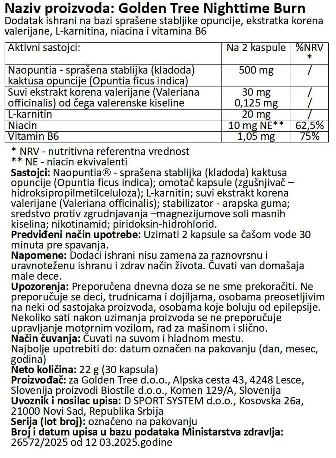 Nutritivna vrednost za GOLDEN TREE NIGHTTIME BURN, 30 kapsula