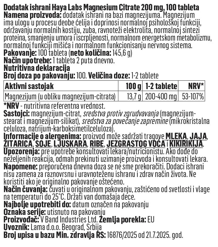 Nutritivna vrednost za Haya Magnesium Citrate 200 mg, 100 tableta