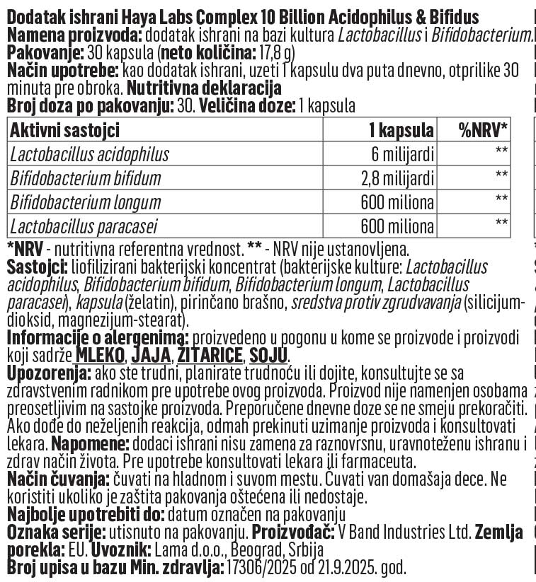 HAYA LABS 10 milijardi Acidophilus & Bifidus probiotski kompleks može pomoći u slučajevima gubitka „dobrih“ bakterija (npr. nakon uzimanja antibiotika) tako što će ih nadoknaditi.