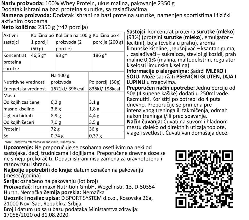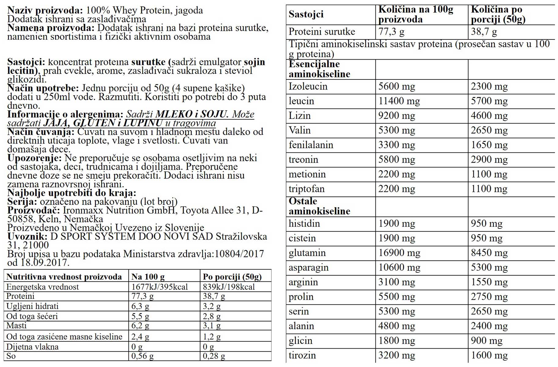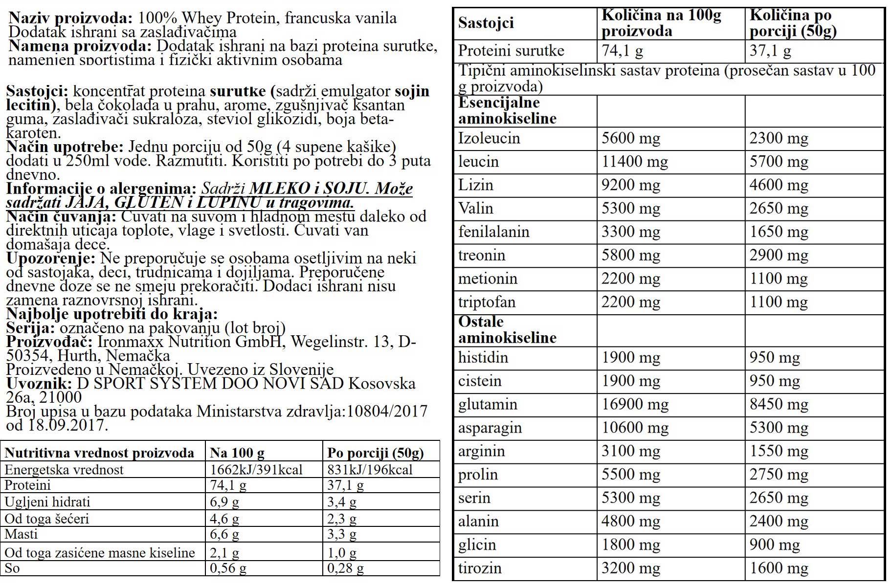 Proteinski prašak od IronMaxx-a, osim toga što je dobrog ukusa, kada ga pomešate s vodom, takođe je hranljiv i odličnog kvaliteta za vaš novac. Svaka doza 100% surutkinog proteina sadrži 38,5 g čistih, brzo iskorištenih surutkinih proteina, sa vrlo malo masti, holesterola i laktoze. Idealan je protein za uzimanje nakon treninga i učinkovita su pomoć mišićnom rastu i regeneraciji.