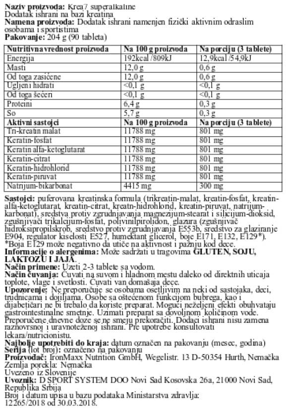 Nutritivna vrednost za IRONMAXX KREA7 SUPERALKALIN, 90 tableta