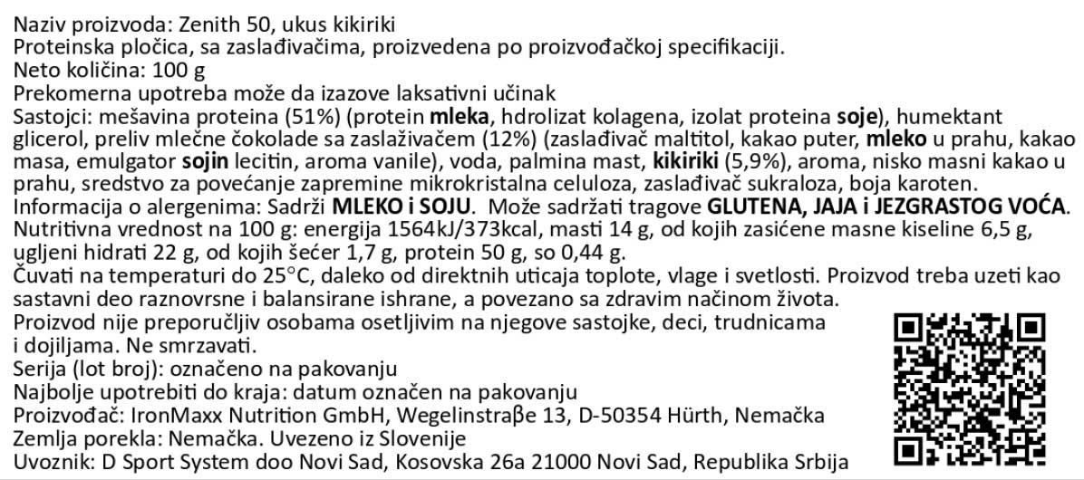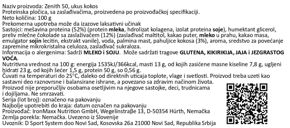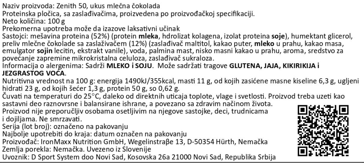 100 g IronMaxx Zenith čokoladice se odlikuju visokim sadržajem proteina, čak 54% i minimalnim sadržajem ugljenih hidrata. Time je ova čokoladica nezaobilazan izvor proteina, a naročito za one, koji su na strogoj proteinskoj dijeti! IronMaxx Zenith čokoladica je idealan izvor proteina u svakoj situaciji, bilo gde, bilo kada! Naročito je pogodna za sportiste, tokom ili nakon treninga, jer je sadržaj mlečnih proteina obogaćen aminokiselinama i ima visoku biološku vrednost. Visok procenat proteina utiče na povećanje i održavanje mišićne mase. Ovaj praktičan oblik proteina životinjskog i biljnog porekla je u isto vreme i odličnog ukusa i time nije interesantan samo za sportiste. Svako može u trenutku, kad oseti glad, umesto čokoladne pločice pojesti zdravu i alternativnu čokoladicu, koja sadrži mnogo proteina, malo masti i malo šećera.
