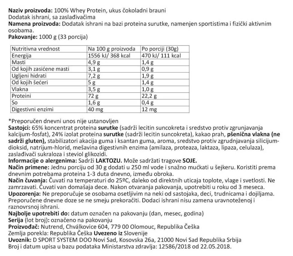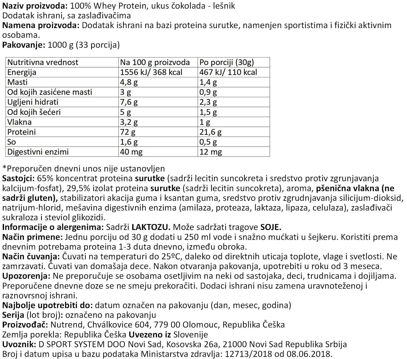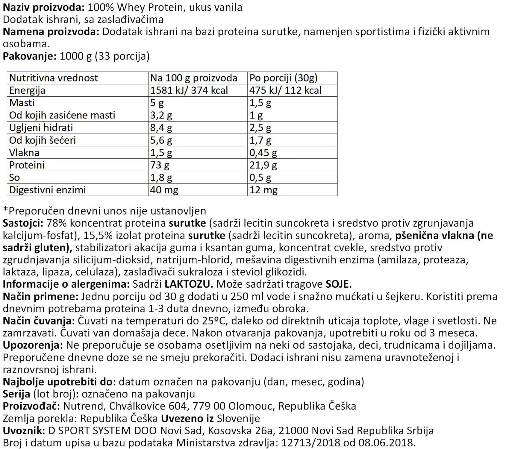 Nutritivna vrednost za NUTREND 100% WHEY PROTEIN (NOVI), 1000g