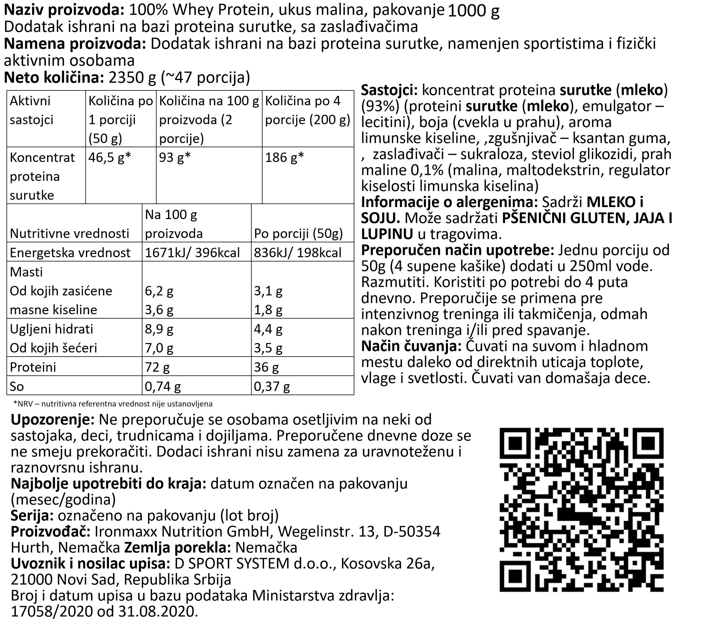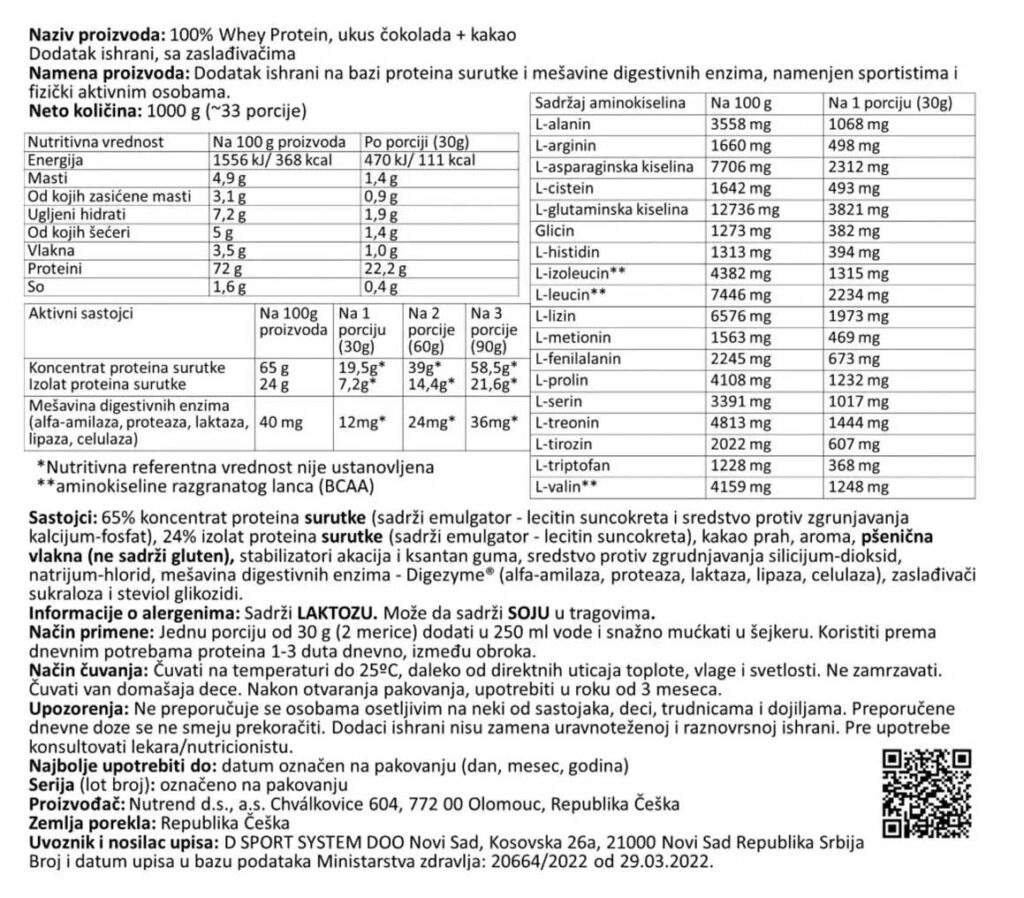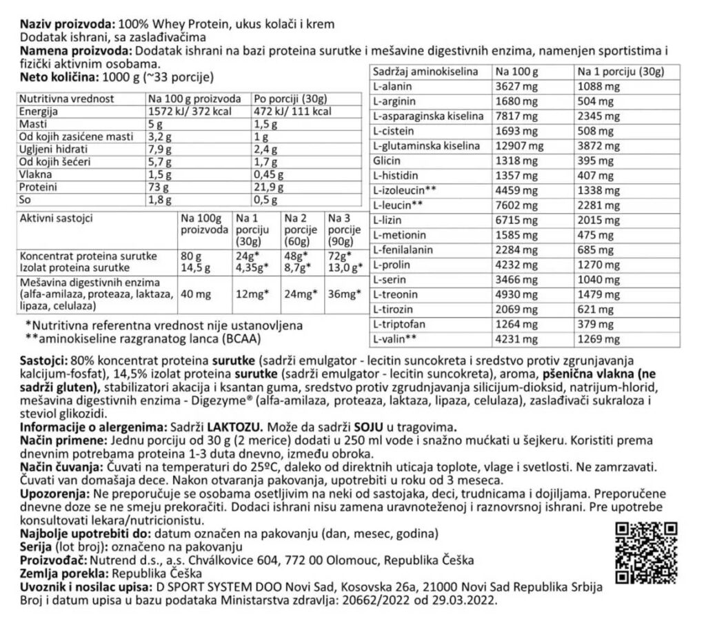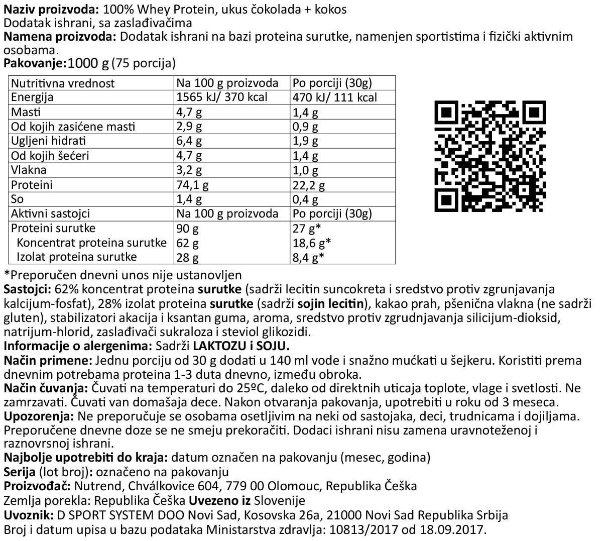 Nutritivna vrednost za NUTREND 100% WHEY PROTEIN (NOVI), 1000g