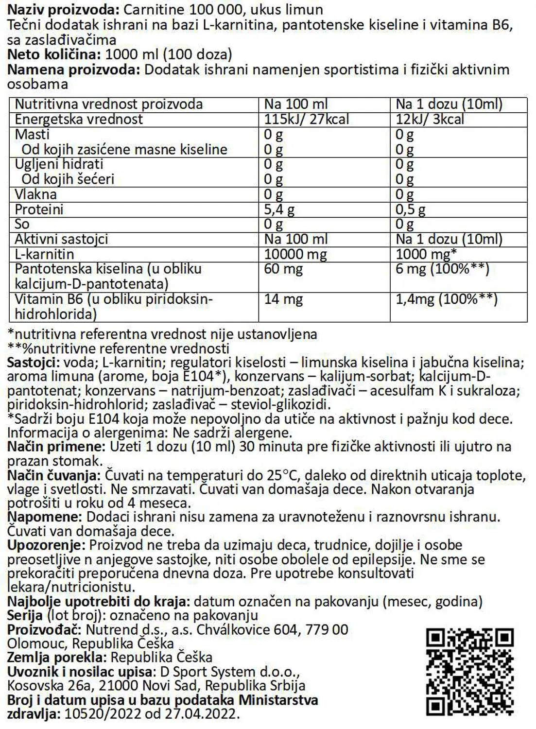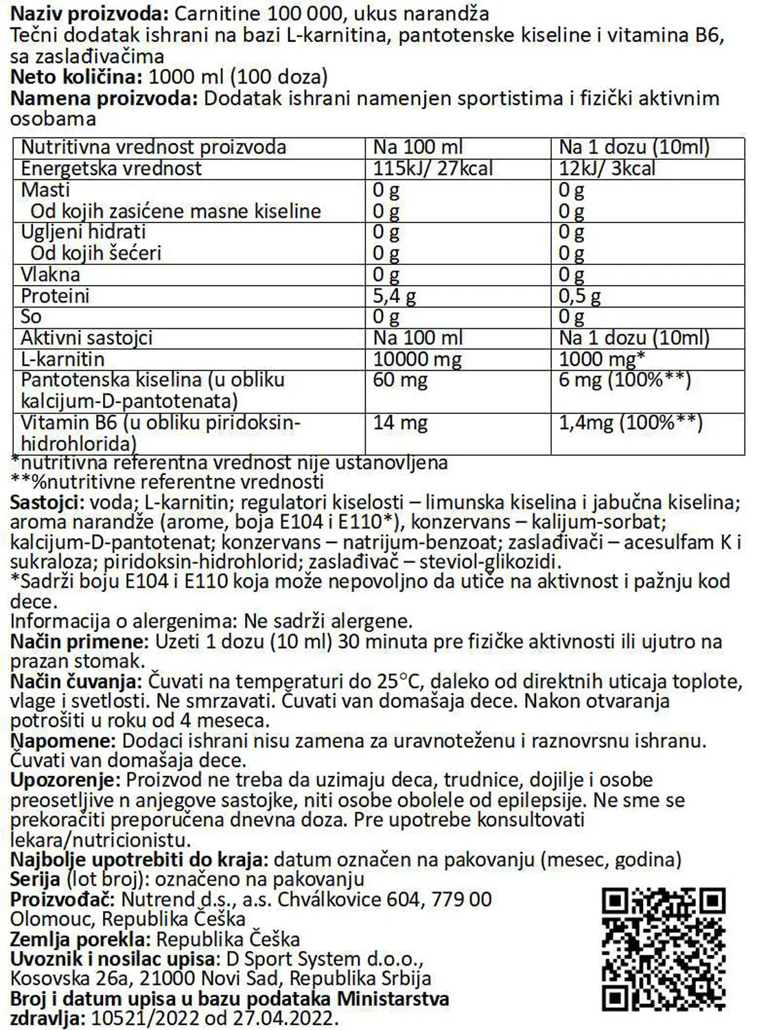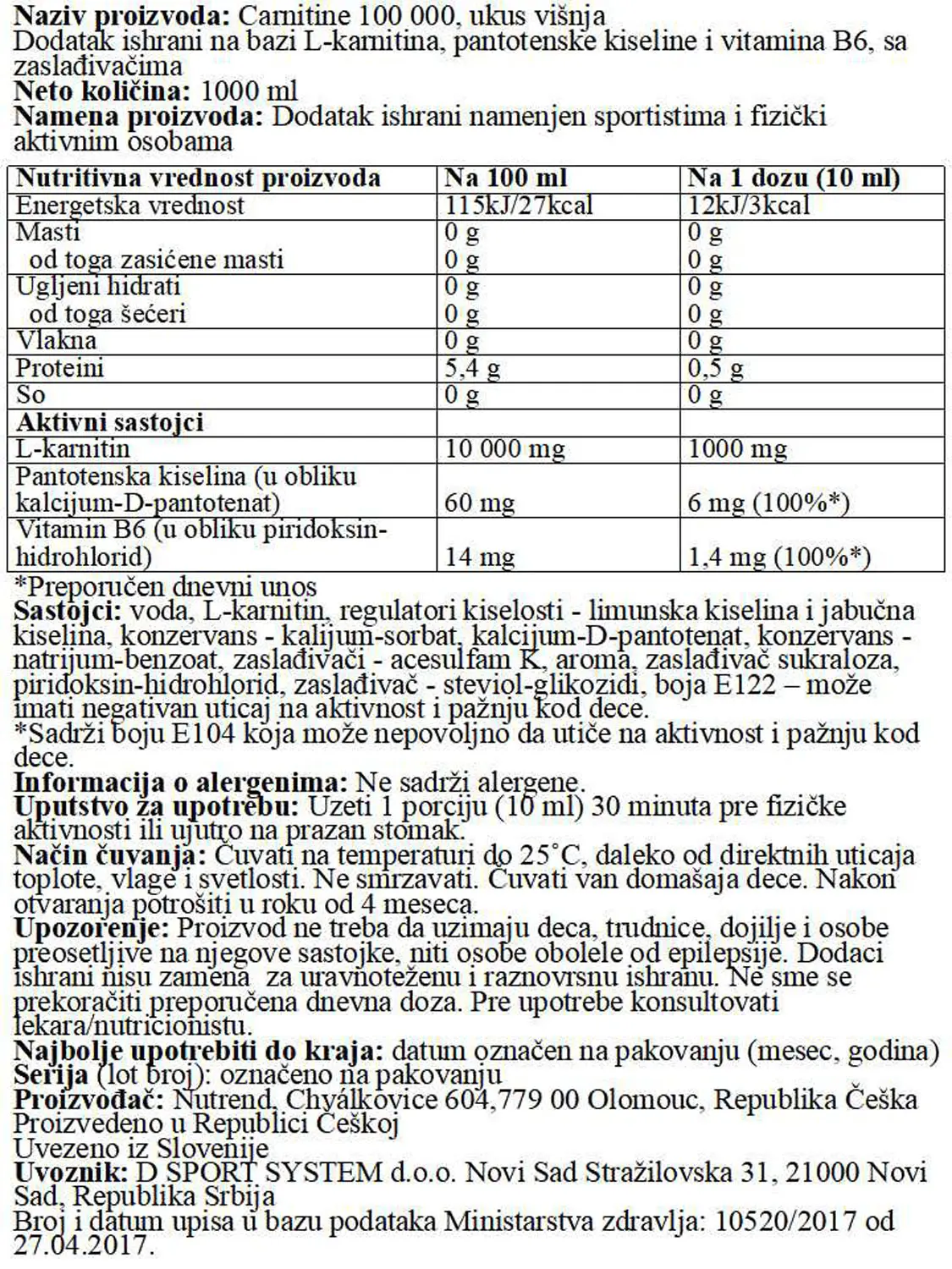 Nutritivna vrednost za NUTREND CARNITINE 100 000, 1000ml