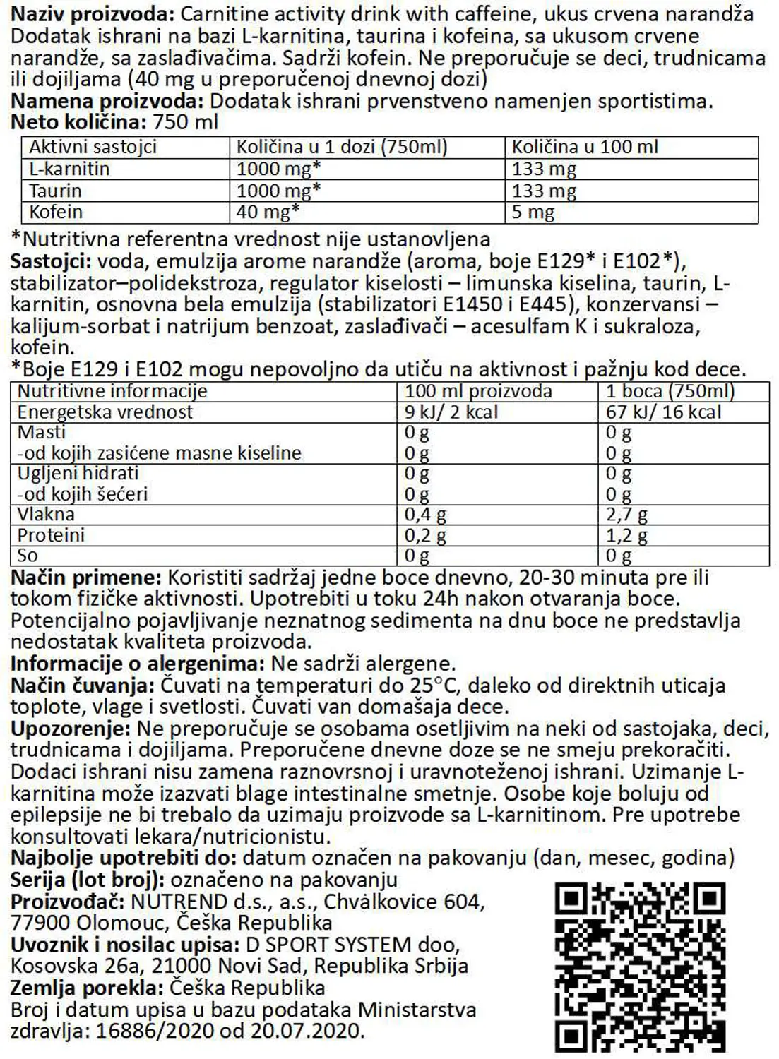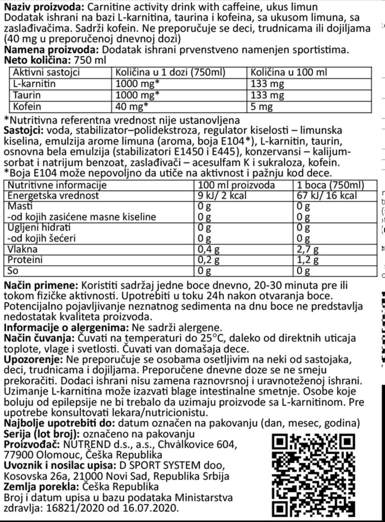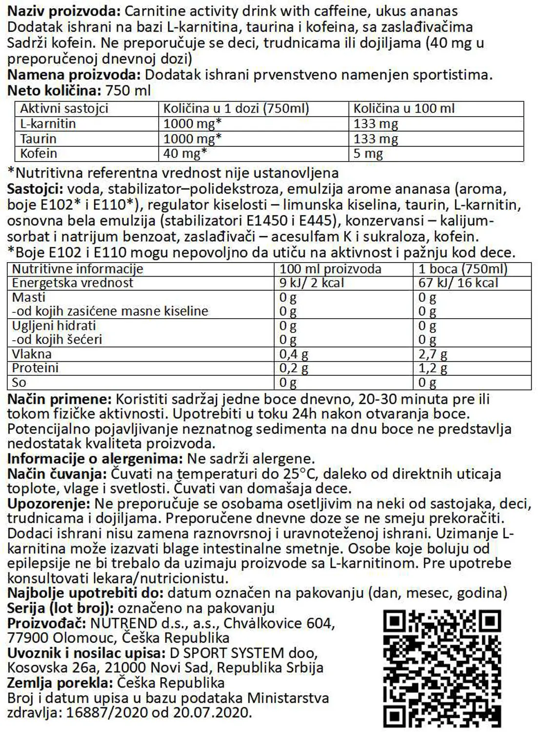 Nutritivna vrednost za NUTREND CARNITINE DRINK, 750ml
