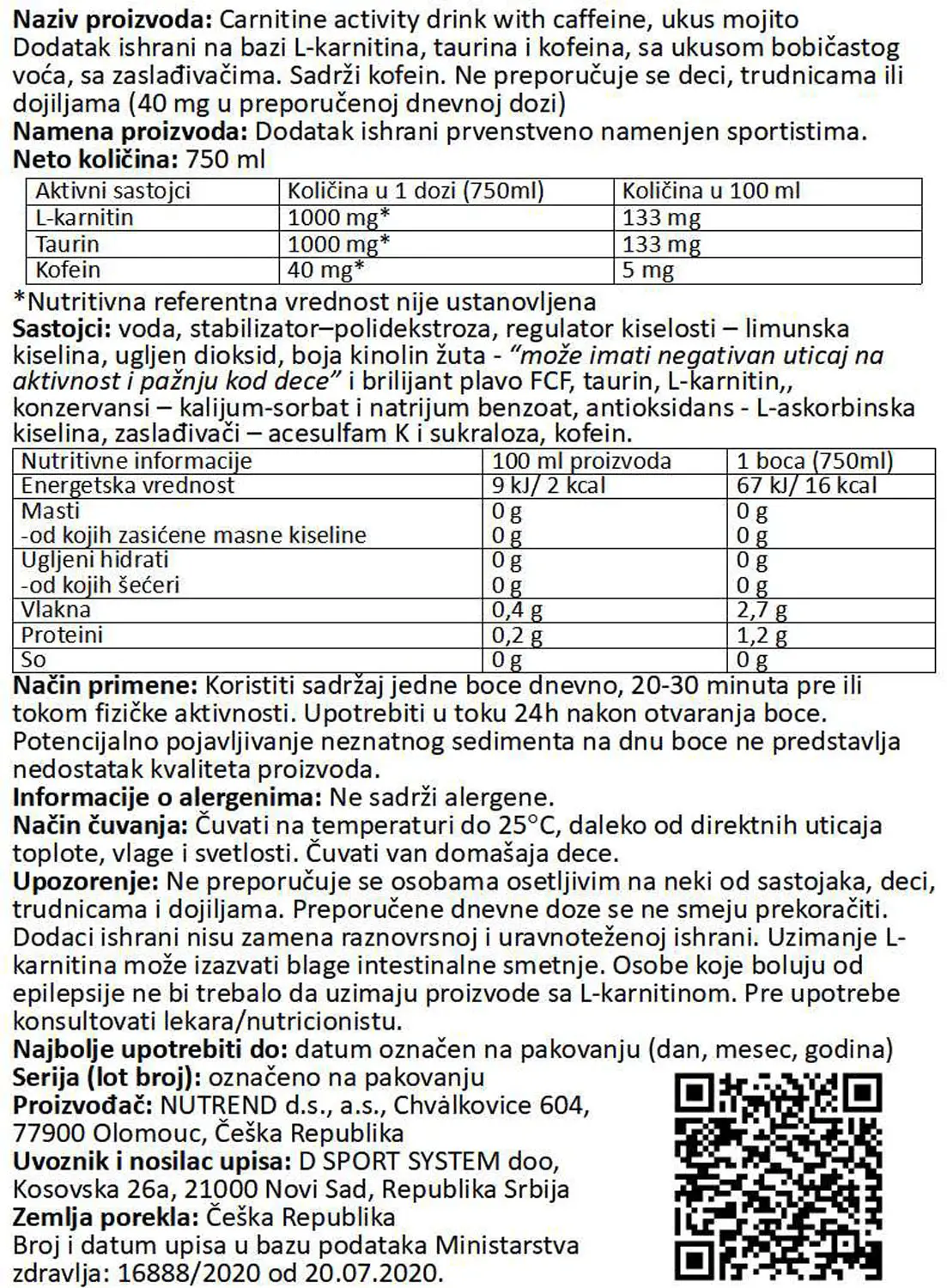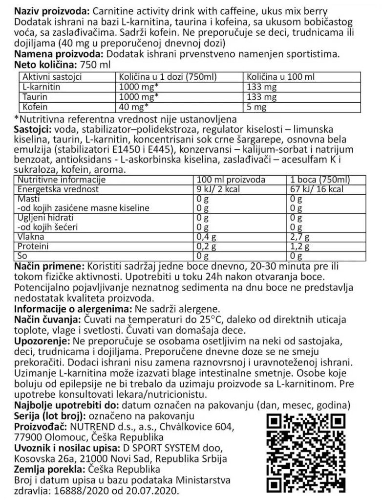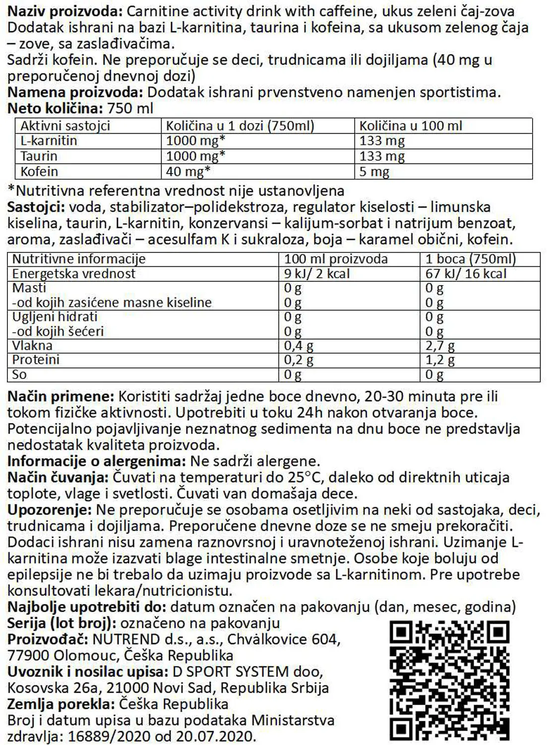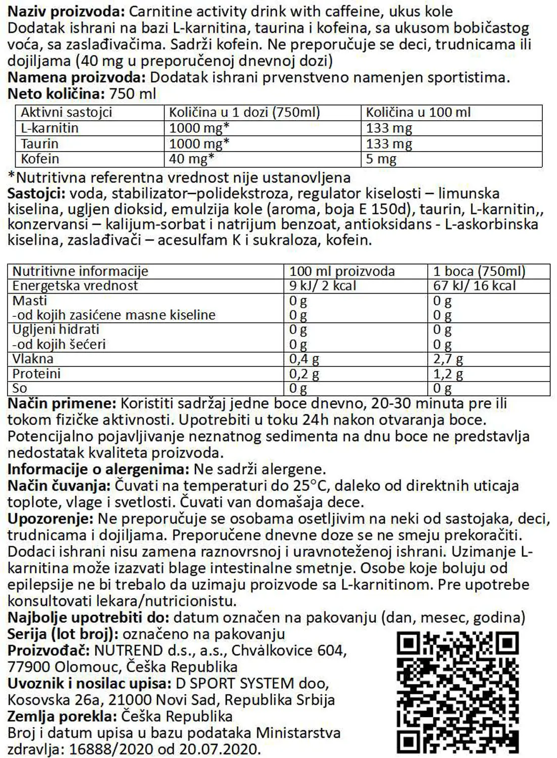 Nutritivna vrednost za NUTREND CARNITINE DRINK, 750ml