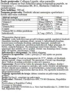 Tečni koncentrat namenjen za razređivanje vodom ili direktnu upotrebu s visokim sadržajem kolagenskih peptida. Obogaćen je vitaminom C koji pomaže u optimalnoj proizvodnji kolagena i dobrom stanju krvnih sudova, kostiju, hrskavice, desni, kože, zuba i kose. Zajedno sa dodatnim vitaminima B6 i B12 dodatno podržava normalnu funkciju imunog sistema i koristan je u borbi protiv umora i iscrpljenosti. Važno je da naša ishrana sadrži optimalnu količinu bakra za održavanje normalnog vezivnog tkiva i cenićete biotin za održavanje normalne kože i sluzokože.