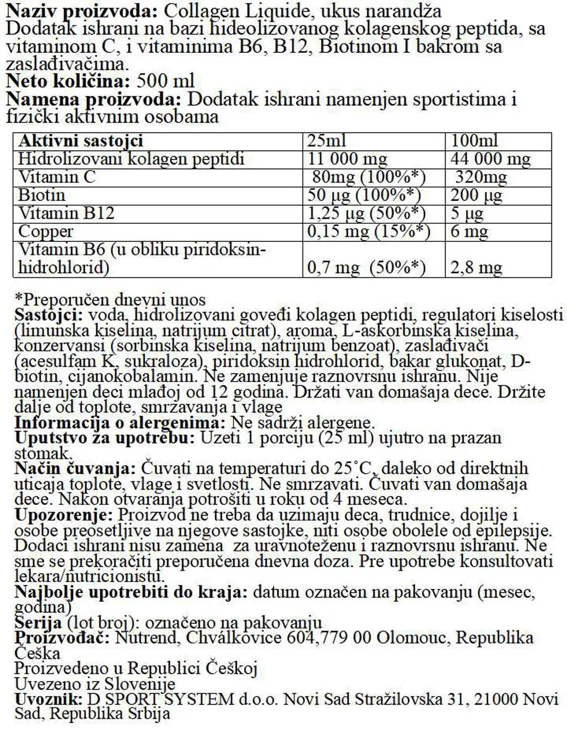 Nutritivna vrednost za NUTREND COLLAGEN LIQUID, 500ml, Orange