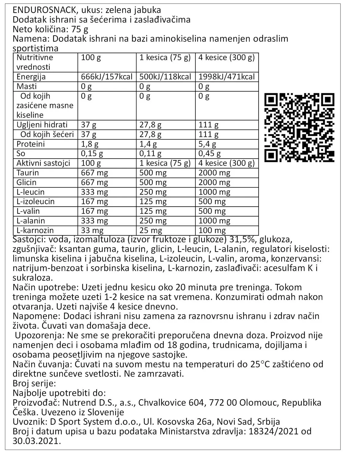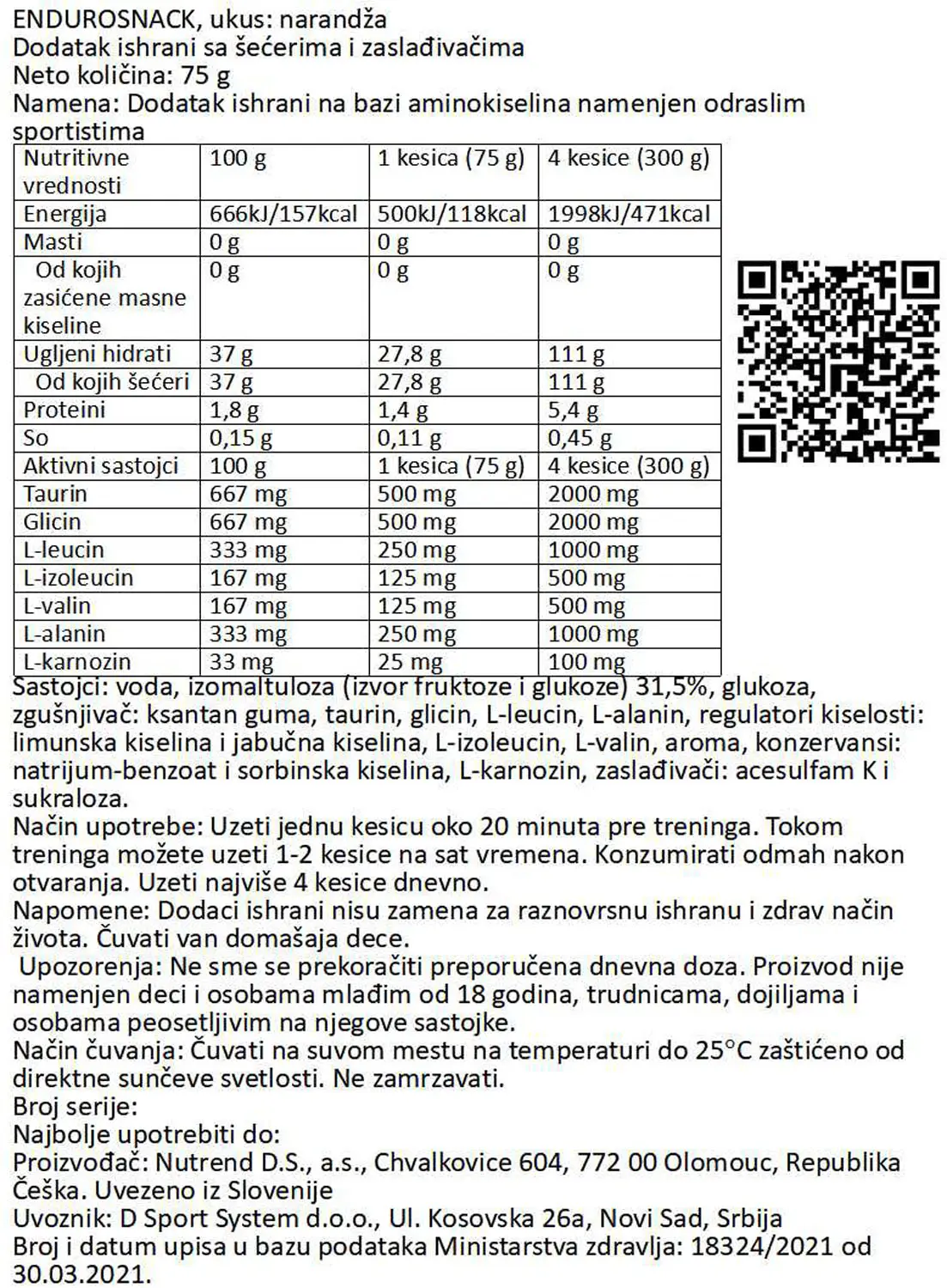 Nutritivna vrednost za NUTREND ENDUROSNACK kesice, 75g