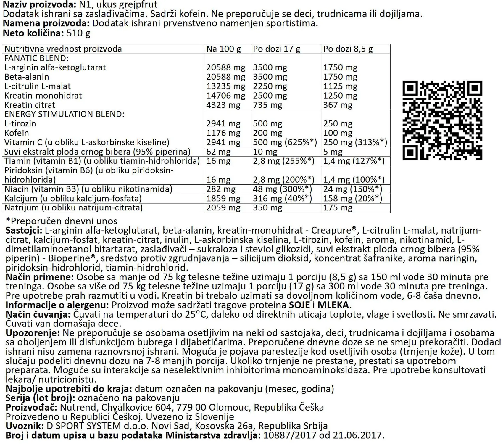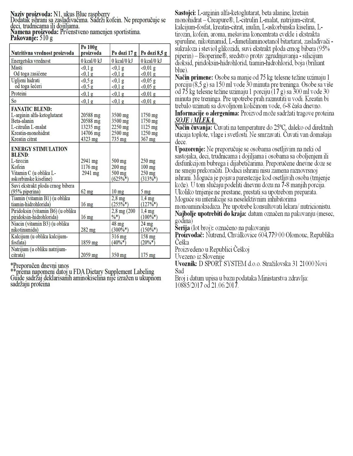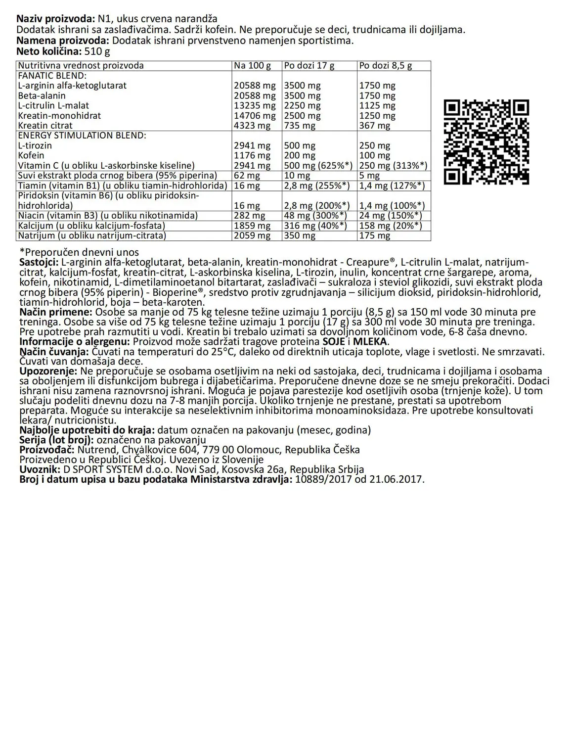 Nutritivna vrednost za NUTREND N1 PRE-WORKOUT, 510g