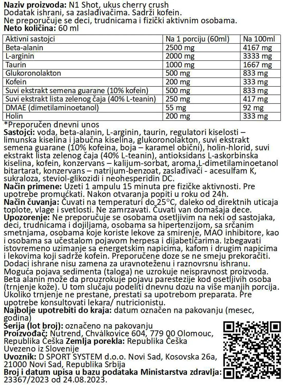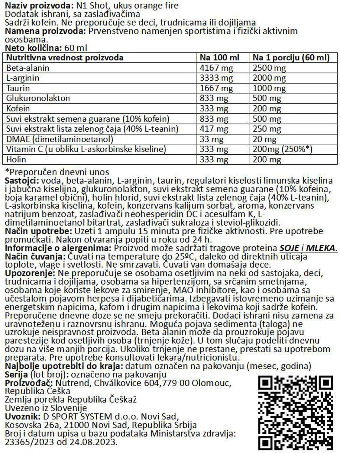 Novi pre-workout N1 SHOT je prvenstveno namenjen svim sportistima, koji žele produžiti stimulativni učinak za postizanje maksimalnog kapaciteta. Osećaj peckanja u telu (parestezija) je prirodna reakcija tela na vrlo efikasne ekstrakte, koji se nalaze u ovom proizvodu.