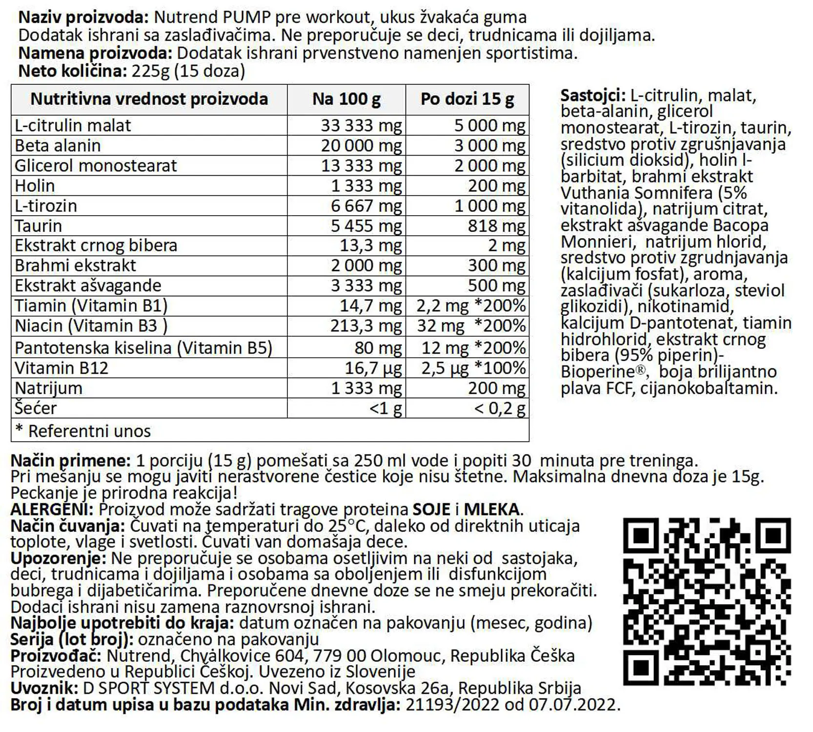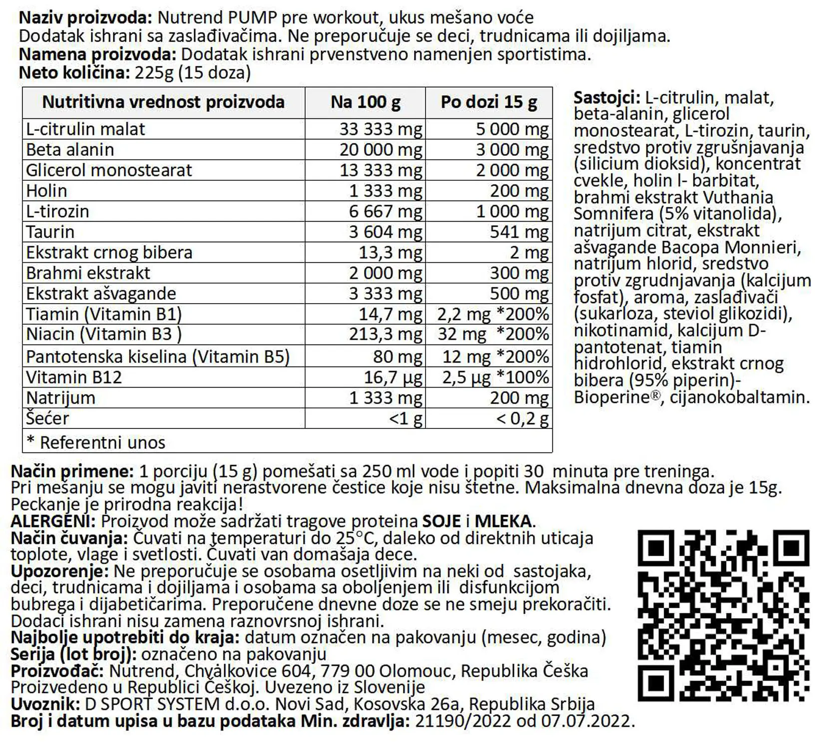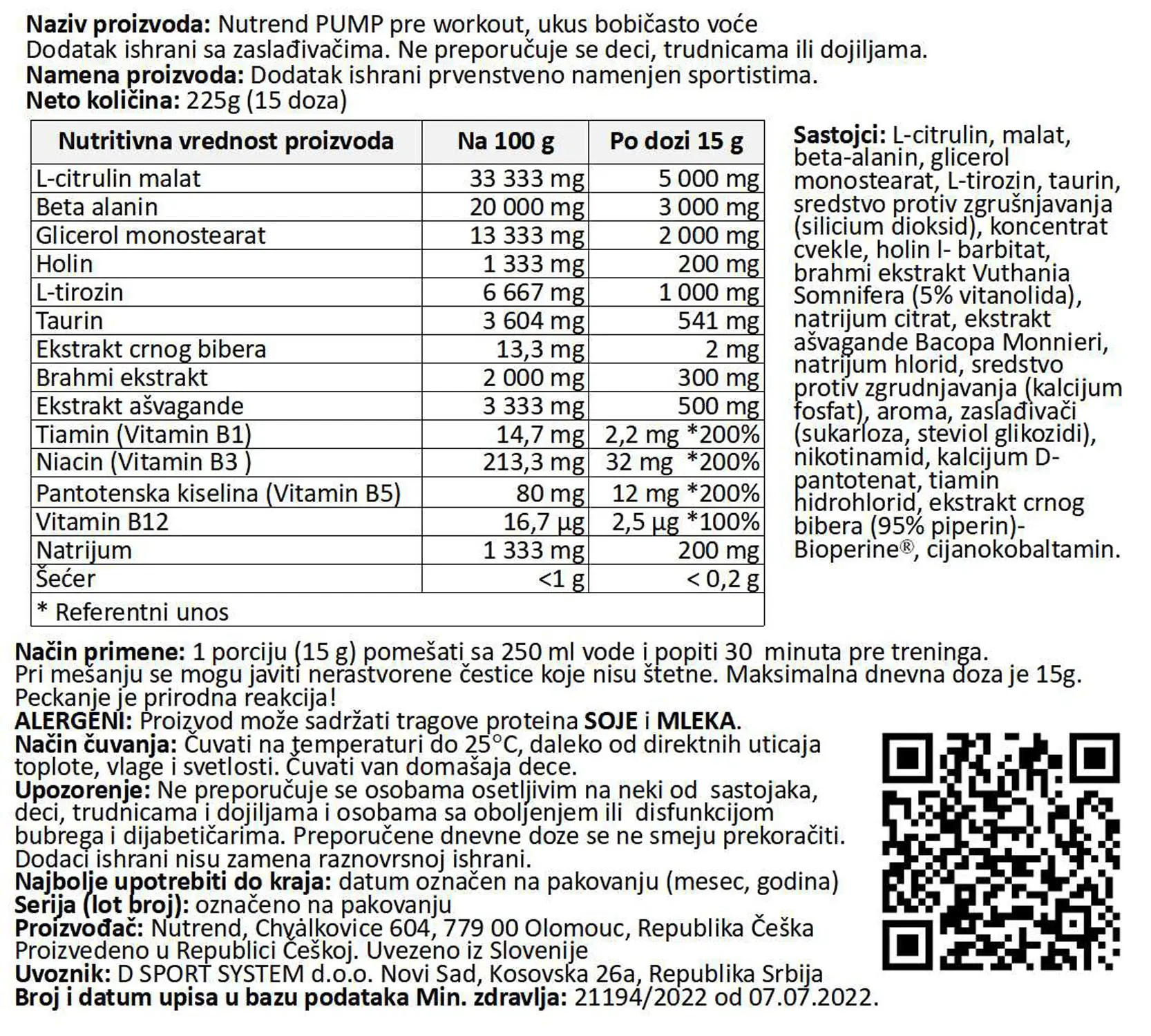 Nutritivna vrednost za NUTREND PUMP, 225g