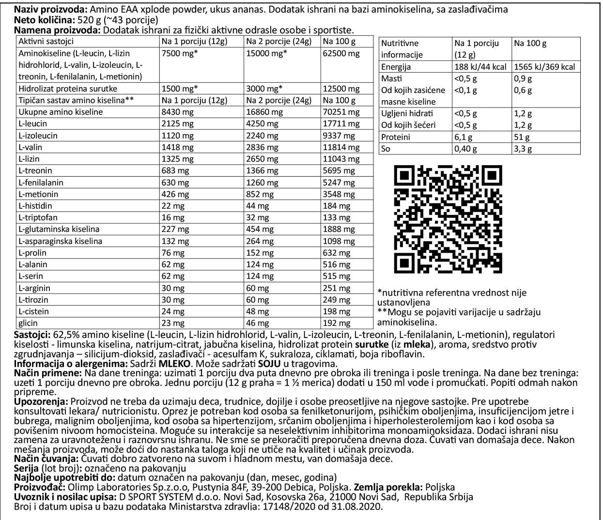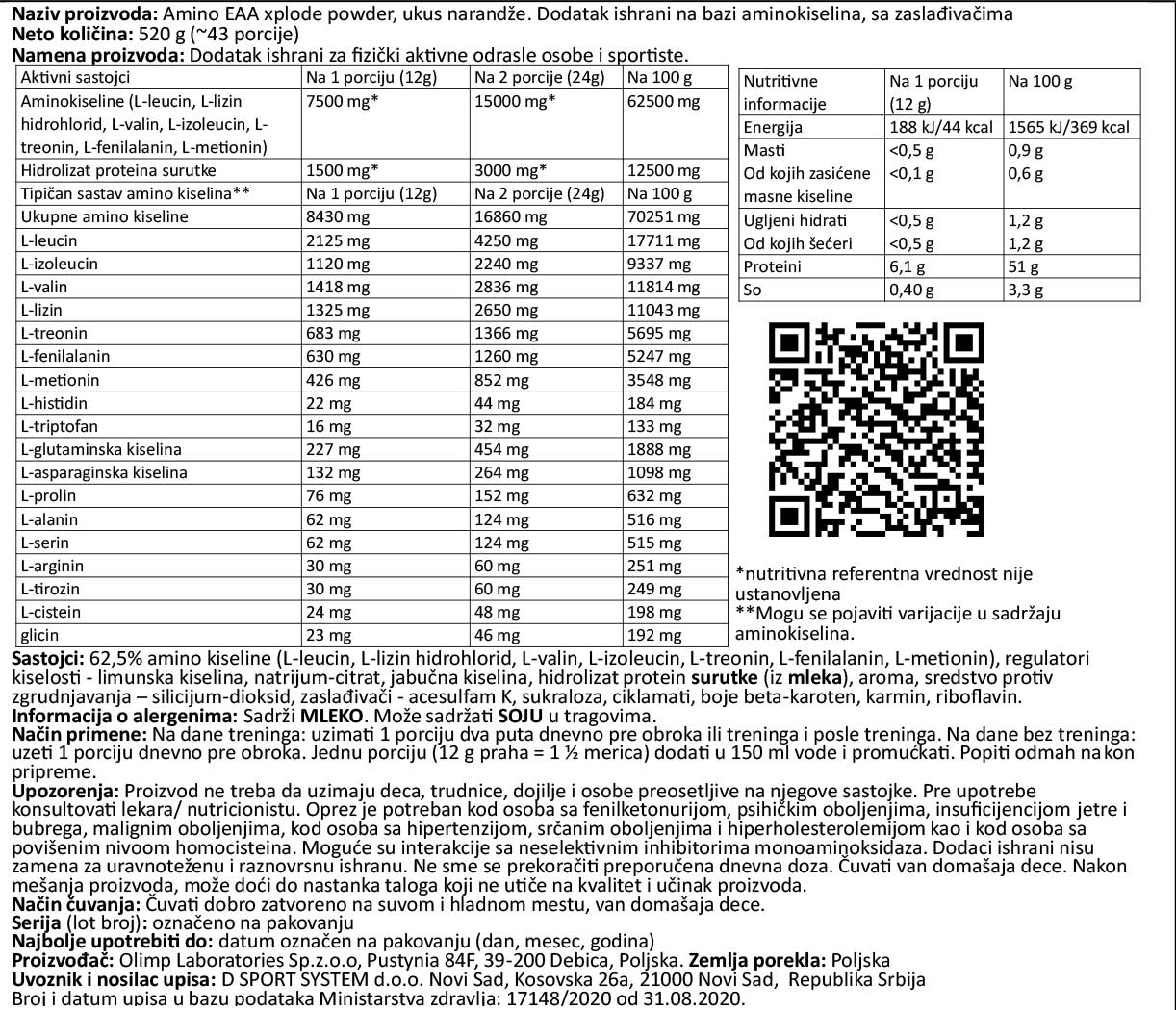 Nutritivna vrednost za OLIMP AMINO EAANABOL XPLODE, 520g