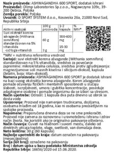 Nutritivna vrednost za OLIMP ASHWAGANDHA 600 SPORT, 60 kapsula