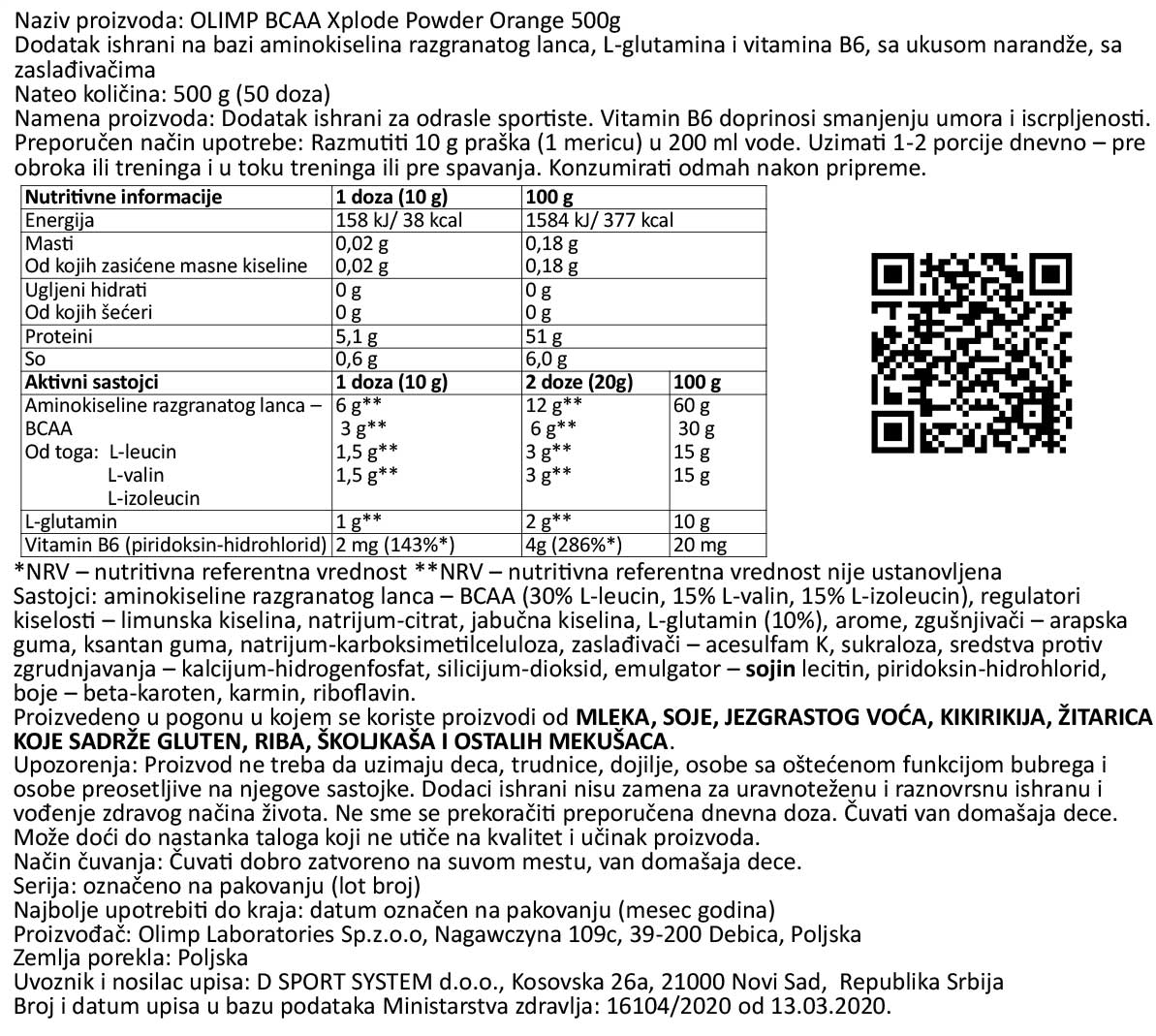 Nutritivna vrednost za OLIMP BCAA XPLODE, 500g