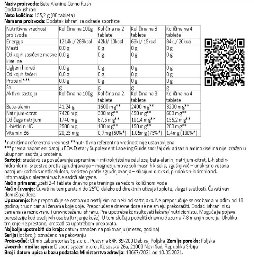 Nutritivna vrednost za OLIMP BETA ALANINE CARNO RUSH, 80 tableta