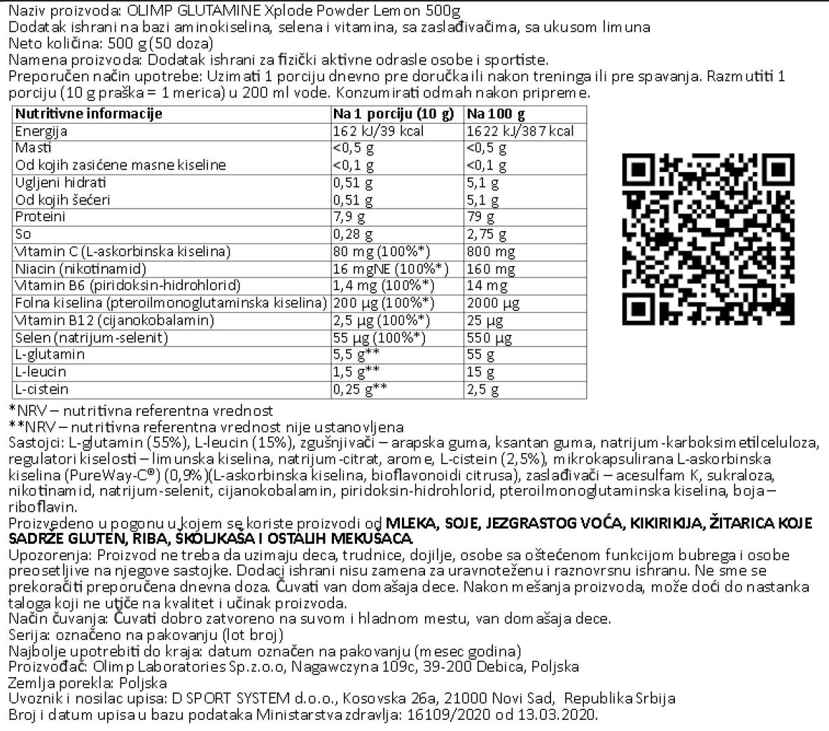 Nutritivna vrednost za OLIMP GLUTAMINE XPLODE POWDER, 500g