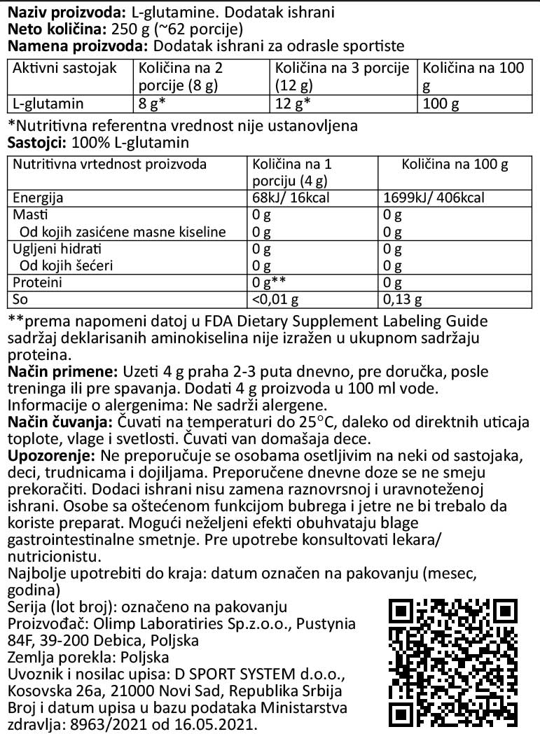 Nutritivna vrednost za OLIMP L-GLUTAMINE POWDER, 250g