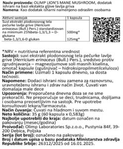 Nutritivna vrednost za OLIMP LION’S MANE MUSHROOM, 60 kapsula