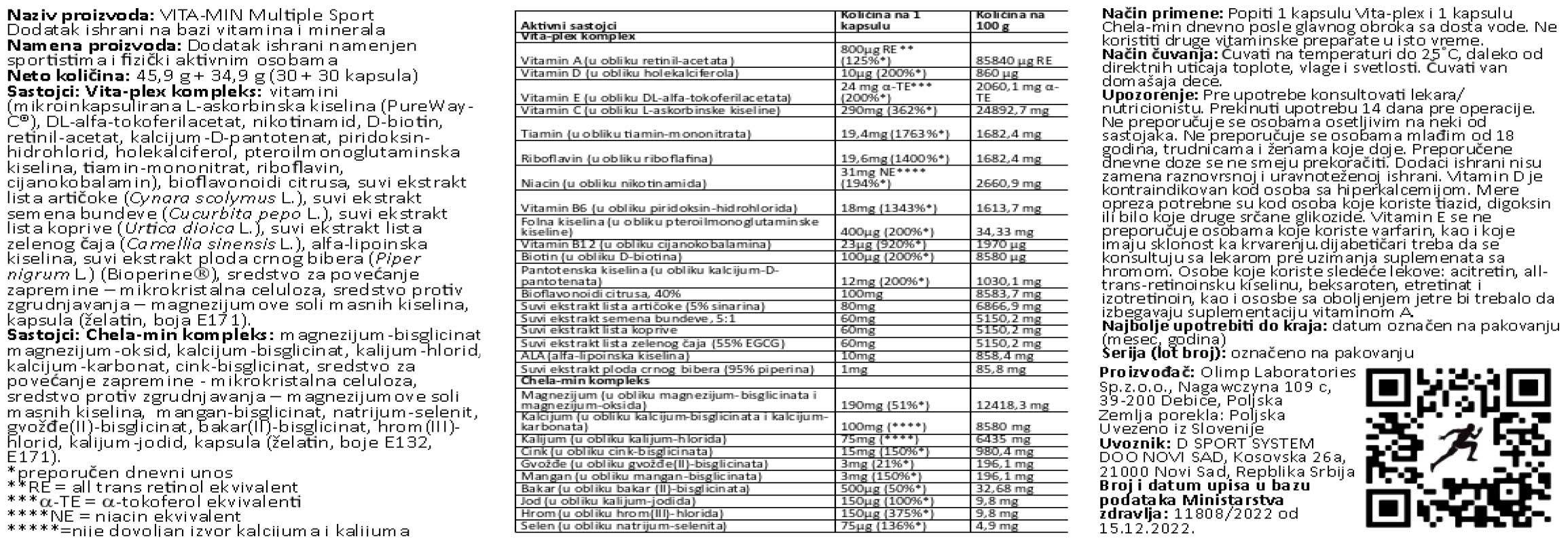VITA-MIN multiple SPORT je dodatak ishrani koji sadrži kompleksnu kombinaciju vitamina i minerala te prirodne biljne ekstrakte. Ovi pažljivo izabrani sastojci snabdevaju telo najvažnijim esencijalnim mikroelementima, koji sprečavaju smanjenje otpornosti, brine se o poboljšanju stanja organizma i zdravlja.
