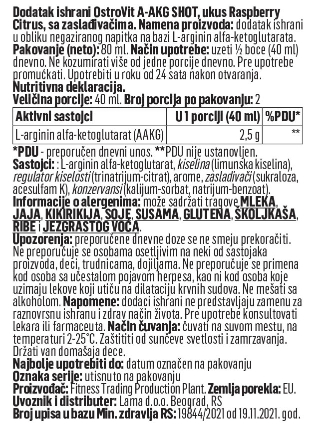 OstroVit A-AKG SHOT sadrži arginin alfa-ketoglutarat, hemijsko jedinjenje glutarne kiseline i arginina.