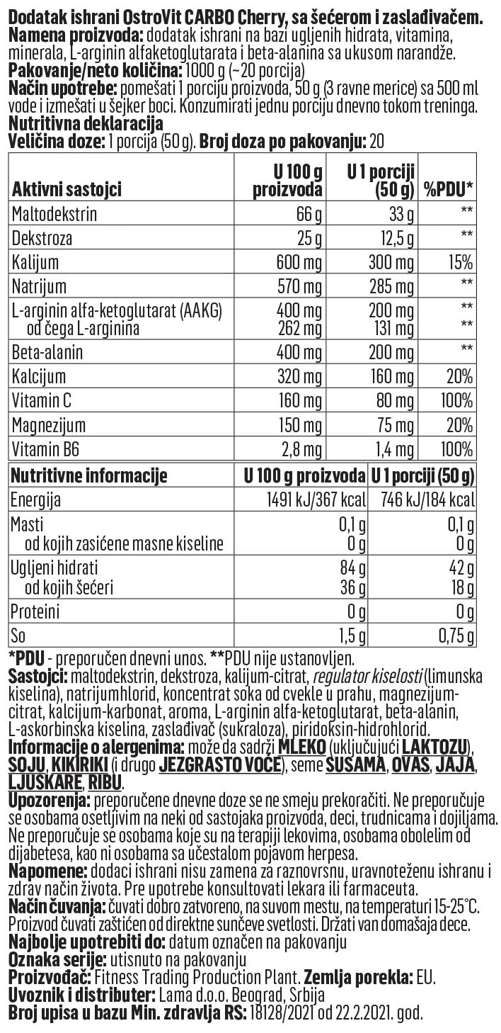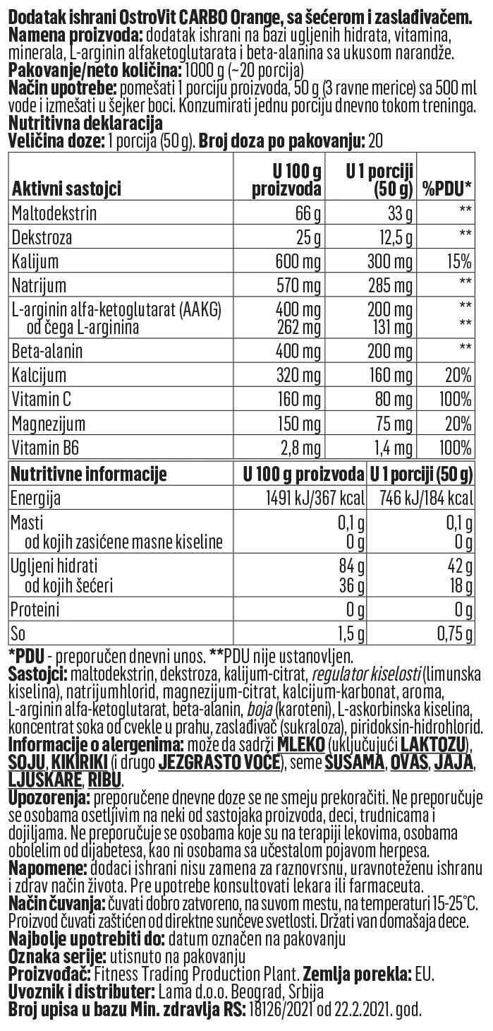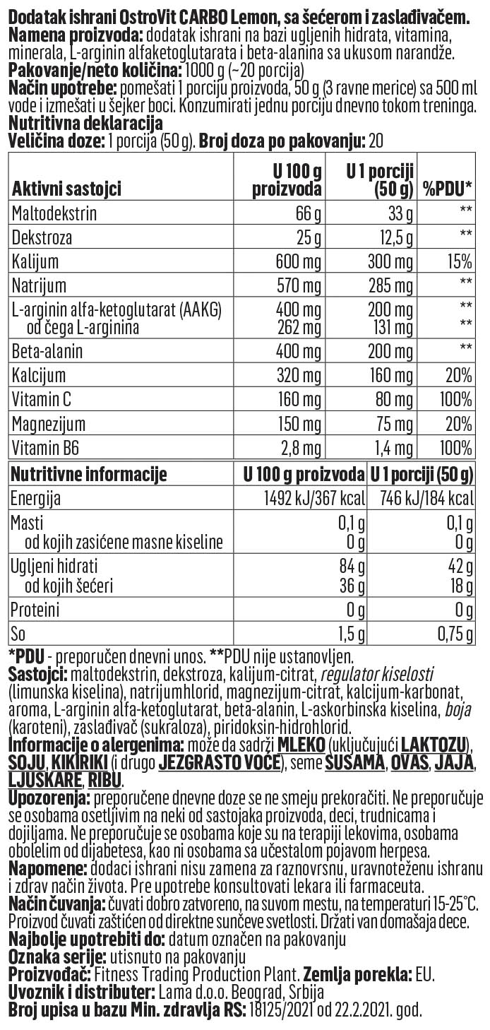Nutritivna vrednost za Ostrovit Carbo, 1000g
