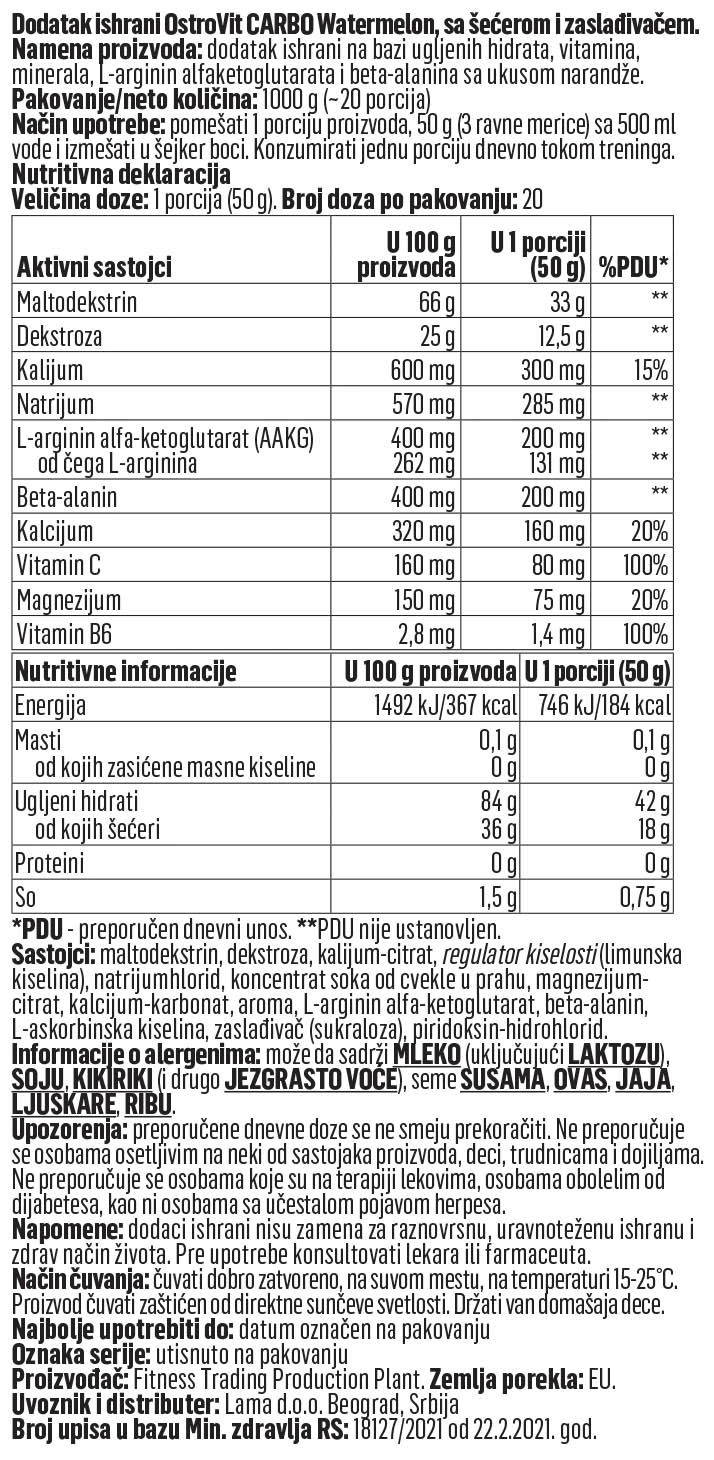 OstroVit Carbo je najkvalitetniji dodatak ishrani ugljenih hidrata, koji se odlikuje veoma kratkim vremenom apsorpcije. Omogućava vam da postepeno snabdevate odgovarajuću količinu energije tokom perioda treninga. Preparat se posebno preporučuje sportistima koji se bave sportovima snage. Pored toga, proizvod je obogaćen esencijalnim mineralima, vitaminima, kao i supstancama koje poboljšavaju cirkulaciju krvi, kao što su L-arginin i Beta-alanin.