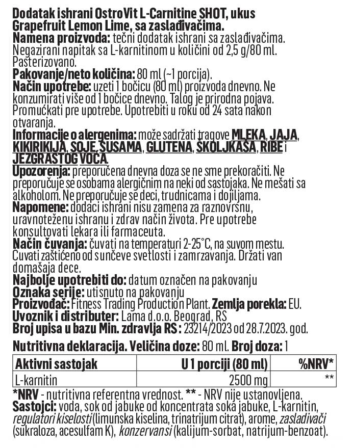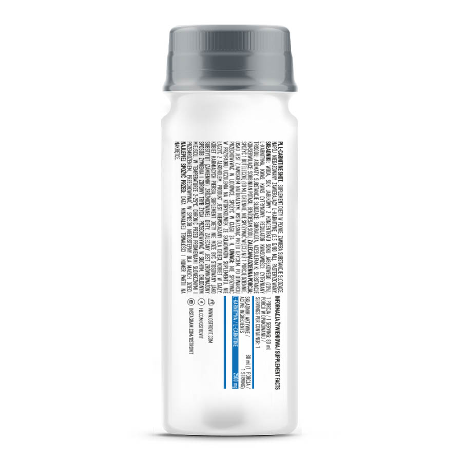 OstroVit L-Carnitine Shot je tečni dodatak ishrani. Sadrži zaslađivače. Negazirano piće koje sadrži L-karnitin. Products je dodatak za ljude koji brinu o svojoj figuri i žele da ubrzaju procese sagorevanja masti, ubrzaju regeneraciju i povećaju izdržljivost na treningu.