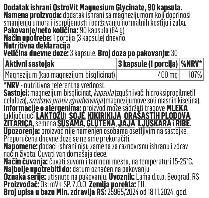 Nutritivna vrednost za OSTROVIT MAGNESIUM GLYCINATE, 90 kapsula