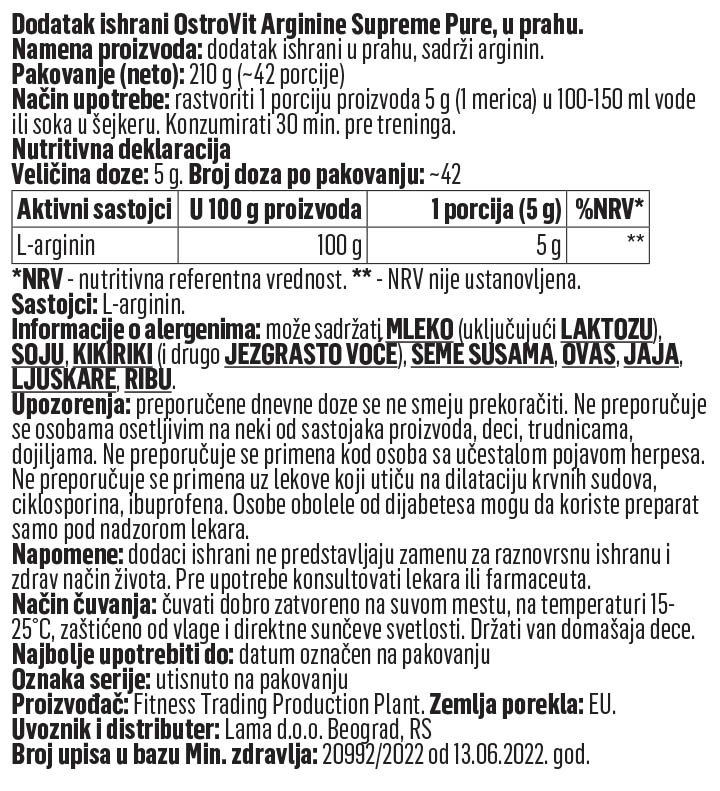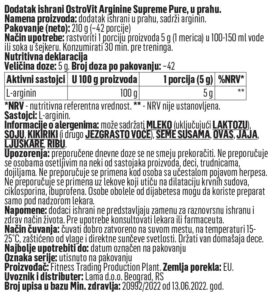 OstroVit Arginin je dodatak koji sadrži sastojak l-arginin. U interesu kvaliteta i zadovoljstva potrošača dodatak je podvrgnut najvišem stepenu mikronizacije, što dokazuje njegovu savršenost. Arginin se smatra jednim od boljih noboostera. Zahvaljujući svojim svojstvima arginin, koji je supstrat za sintezu azot-oksida, snižava krvni pritisak i poboljšava transport kiseonika do naših mišićnih ćelija.