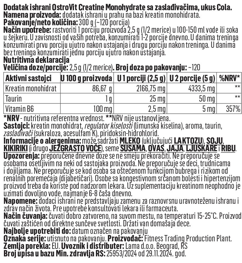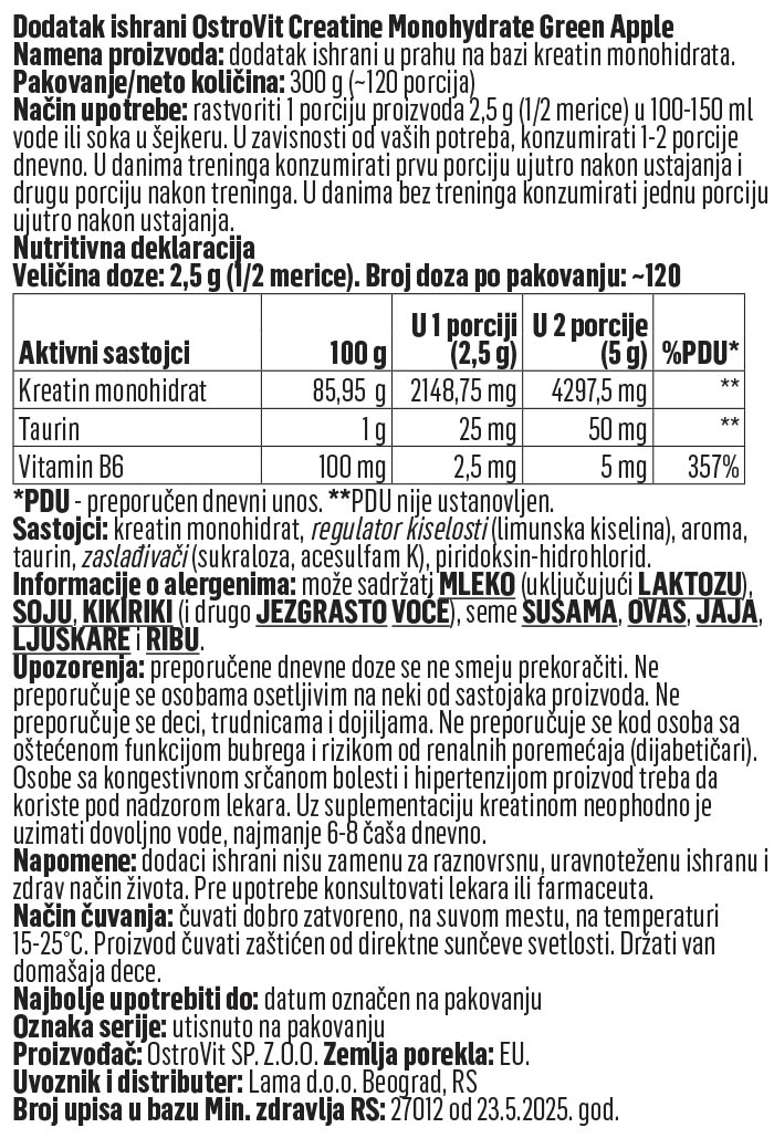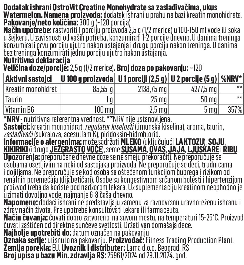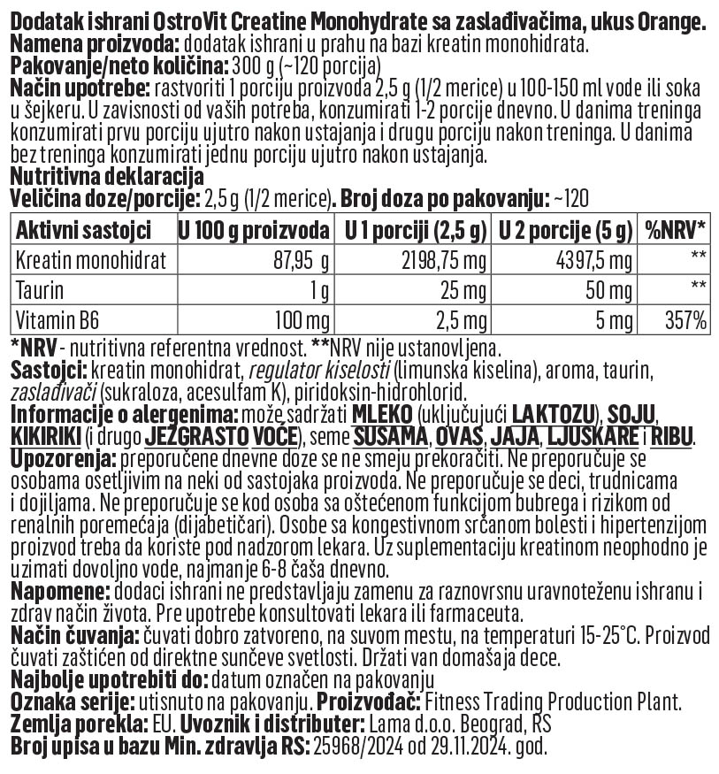 OstroVit koristi visokokvalitetni kreatin-monohidrat sa odličnom topljivošću i bioraspoloživošću. Proizvod je testiran u nezavisnim laboratorijama kako bi se obezbedila njegova čistoća i bezbednost.
